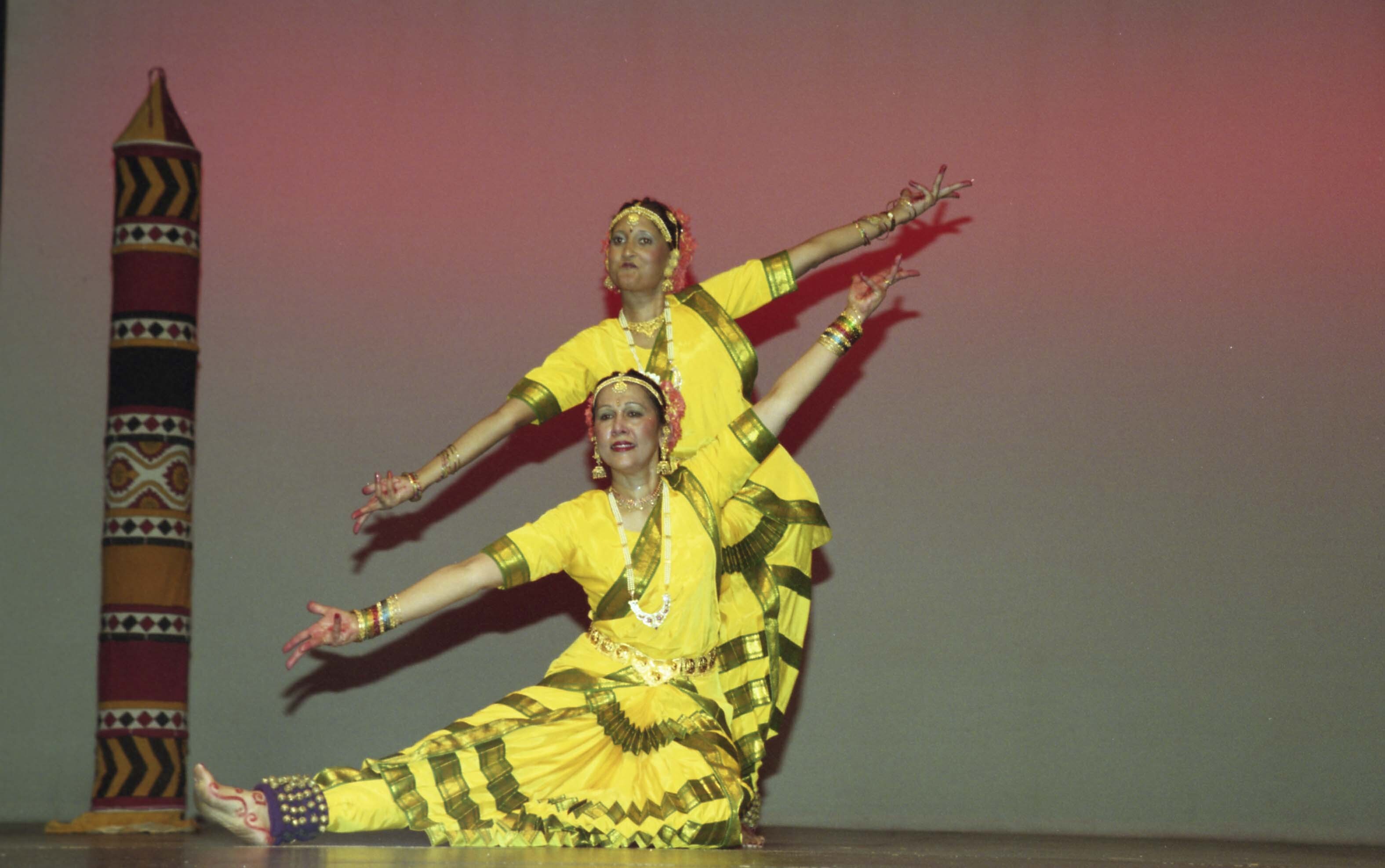 Photograph of unidentified individuals performing bharatanatyam at a dance recital.