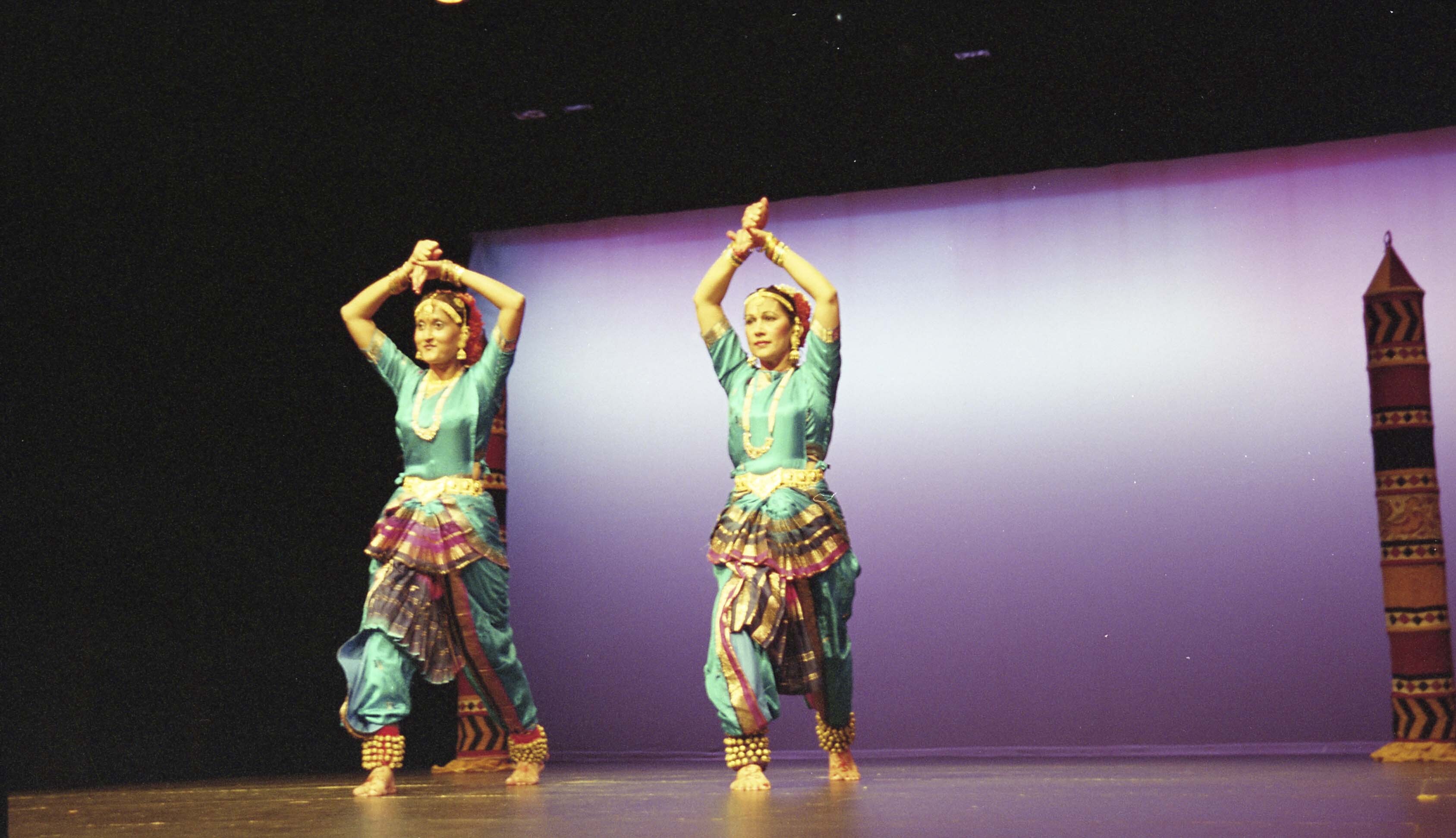 Photograph of unidentified individuals performing bharatanatyam at a dance recital.