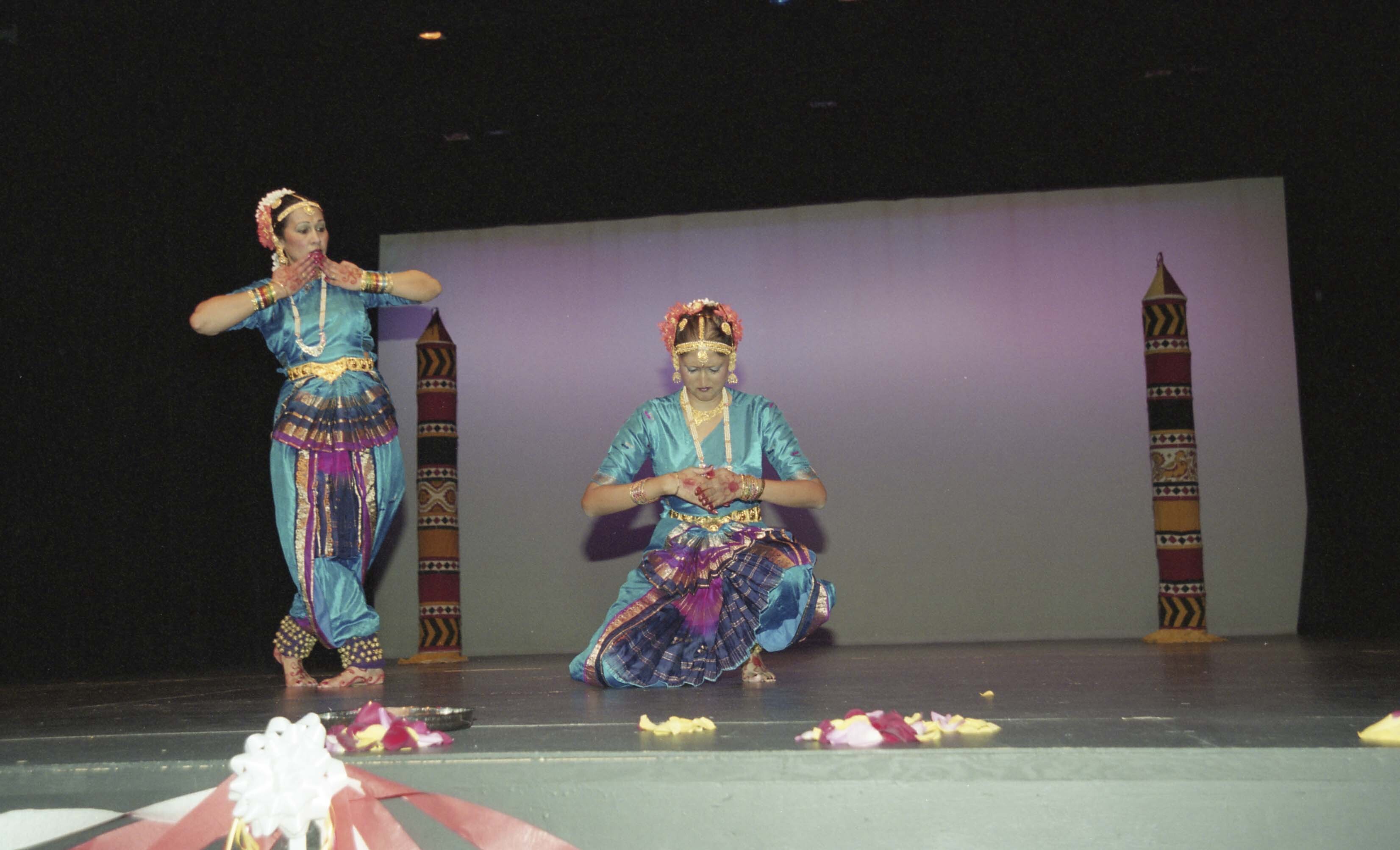 Photograph of unidentified individuals performing bharatanatyam at a dance recital.