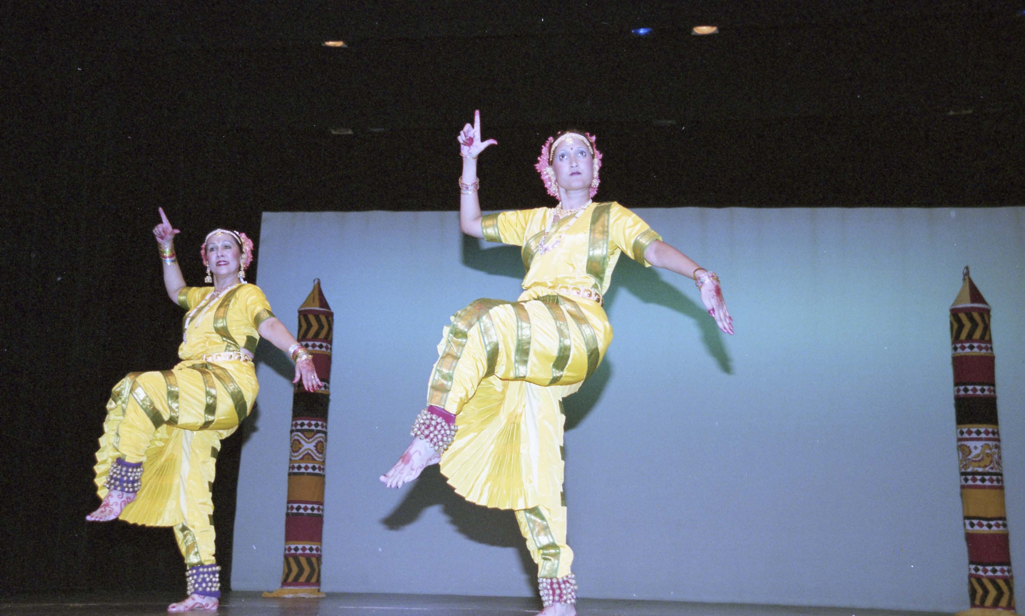 Photograph of unidentified individuals performing bharatanatyam at a dance recital.