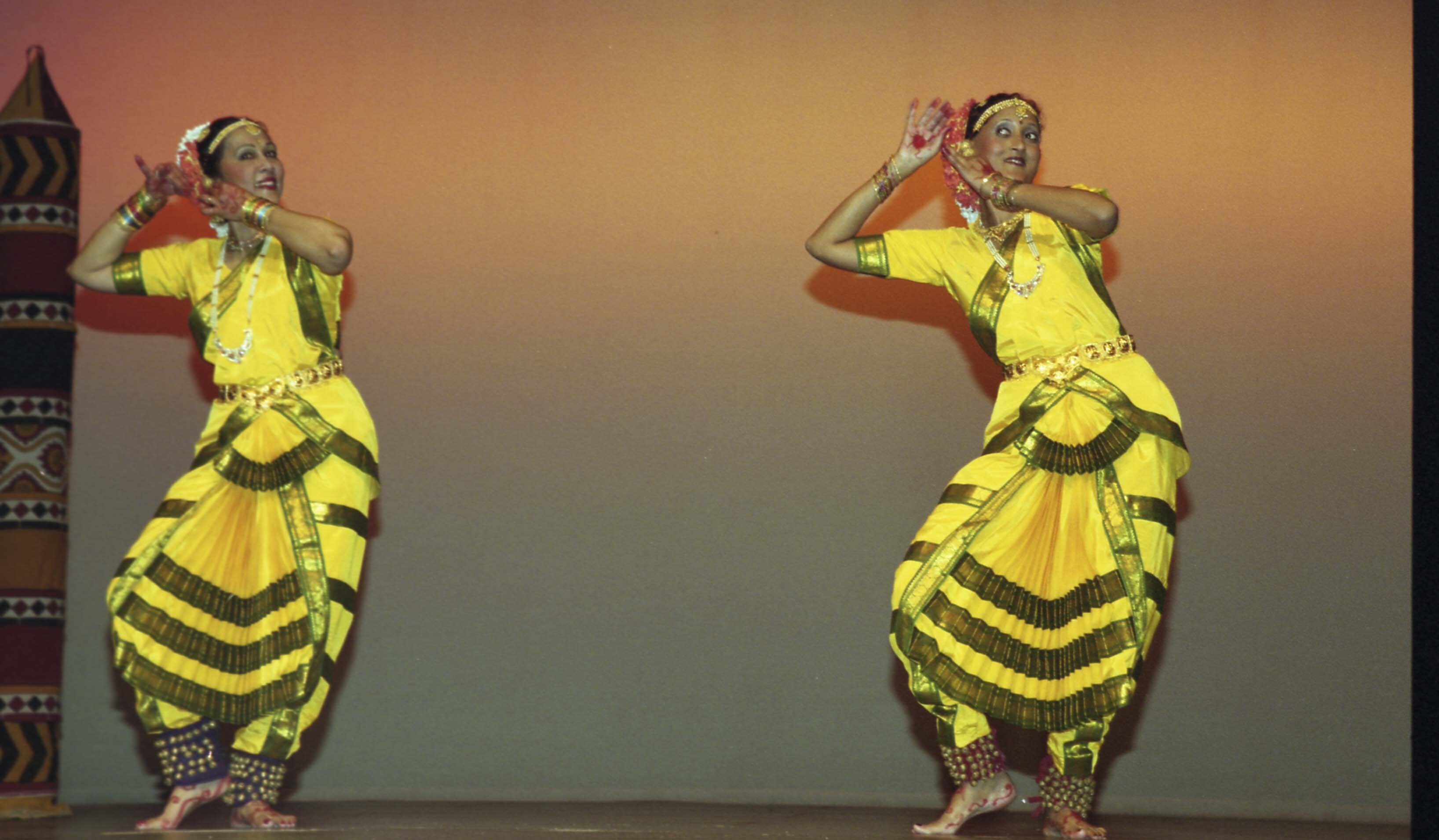 Photograph of unidentified individuals performing bharatanatyam at a dance recital.