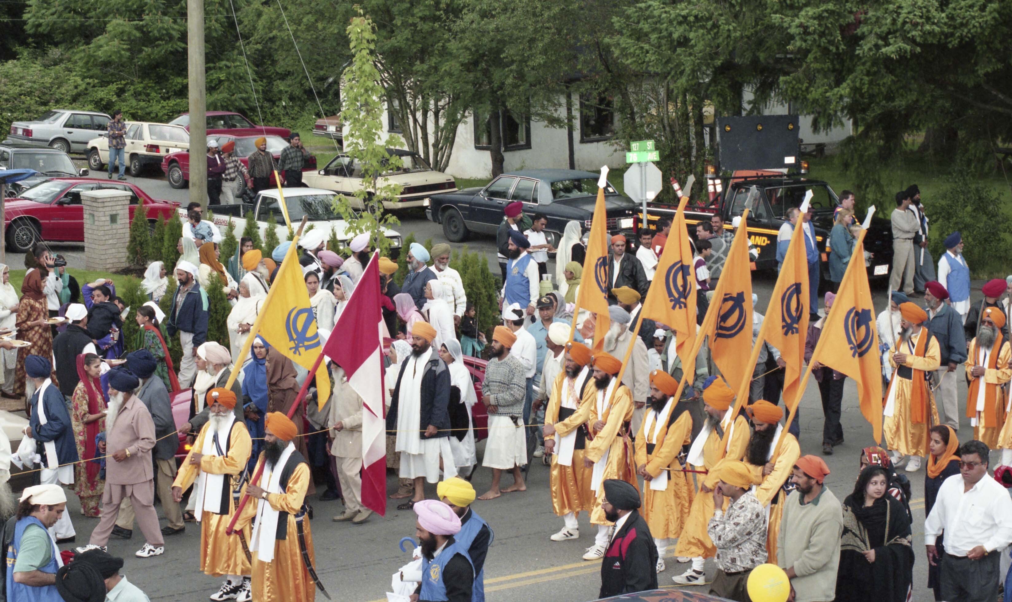 Photograph of a group of unidentified individuals holding a nishan sahib at the Miri Piri Nagar Kirtan which took place in Surrey, British Columbia (B.C.). The Miri Piri Nagar Kirtan is an annual event which takes place in Surrey and is organized by the Guru Nanak Sikh Gurdwara (Temple).