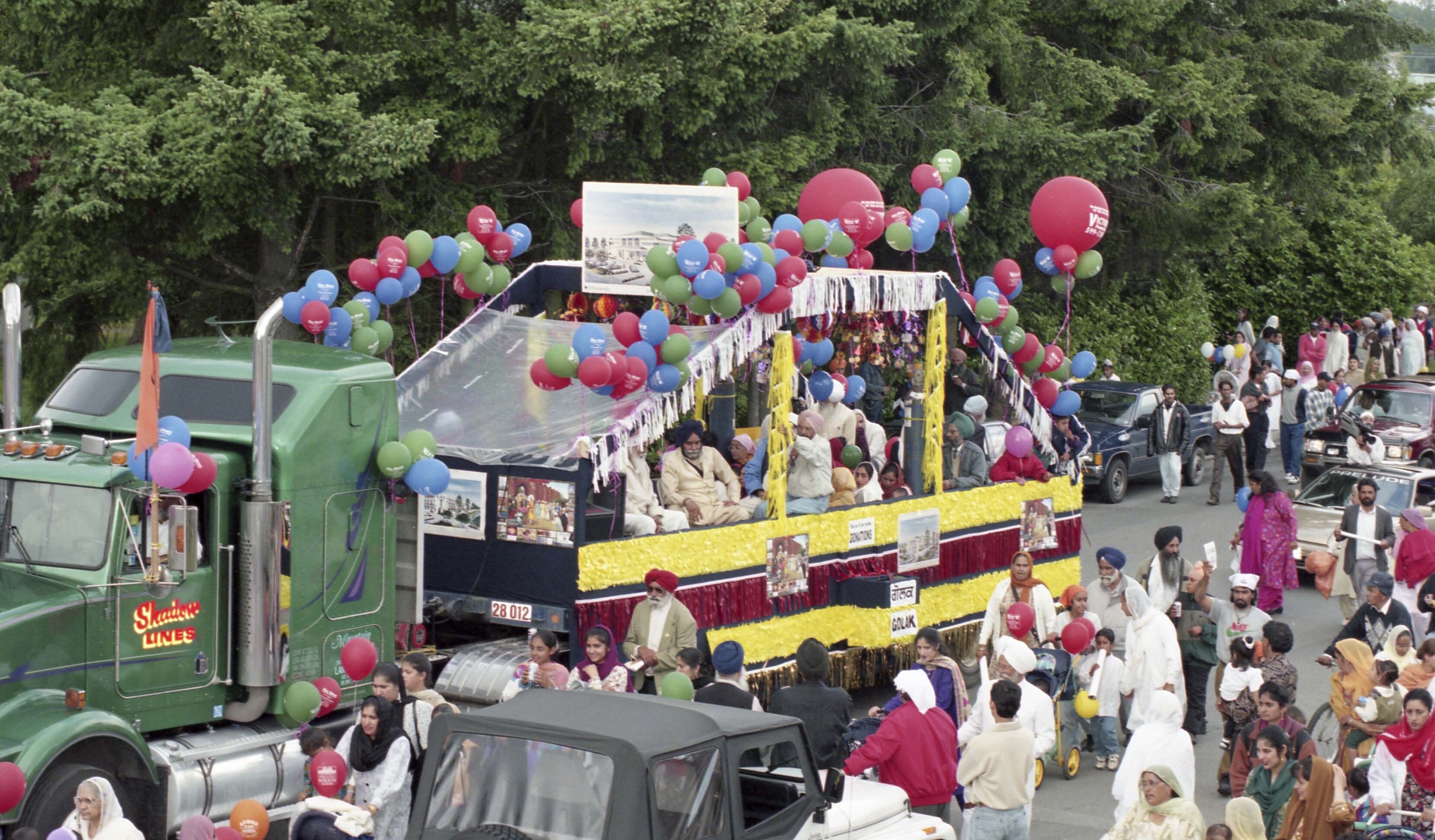 Photograph of a float and a group of unidentified individuals at the Miri Piri Nagar Kirtan which took place in Surrey, British Columbia (B.C.). The Miri Piri Nagar Kirtan is an annual event which takes place in Surrey and is organized by the Guru Nanak Sikh Gurdwara (Temple).
