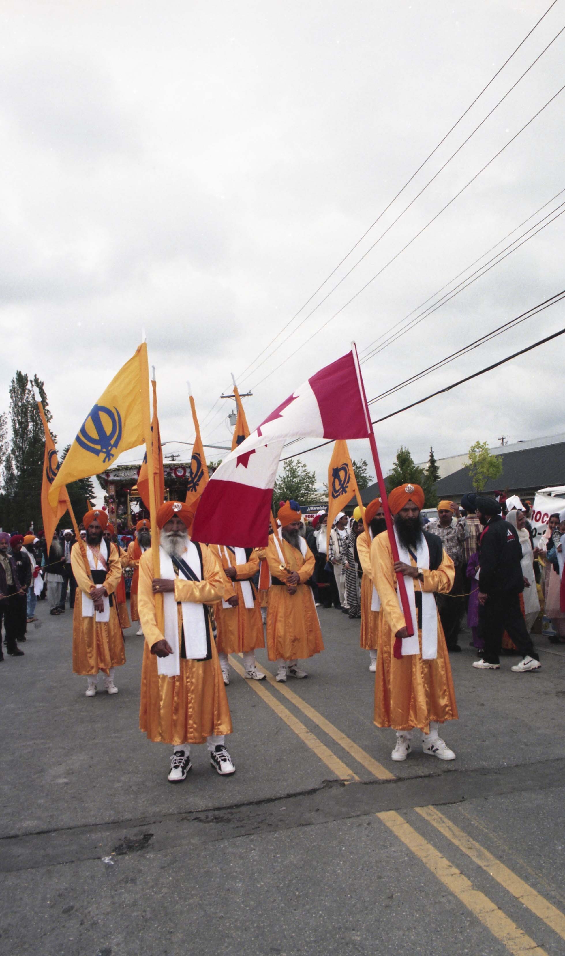 Photograph of a group of unidentified individuals, known as gursikhs, holding the Canadian and nishan sahib flag at the Miri Piri Nagar Kirtan which took place in Surrey, British Columbia (B.C.). The Miri Piri Nagar Kirtan is an annual event which takes place in Surrey and is organized by the Guru Nanak Sikh Gurdwara (Temple).