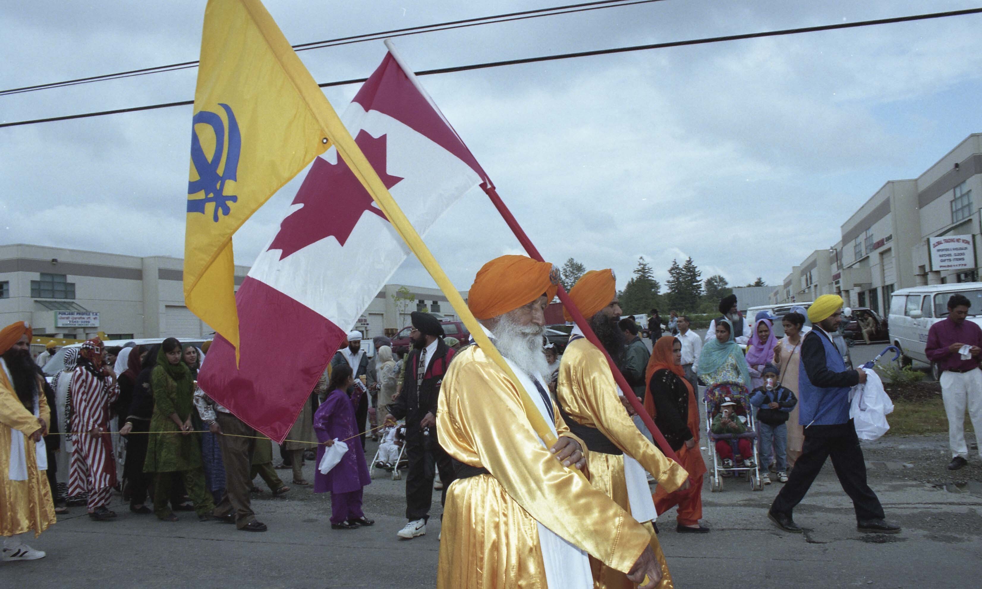 Photograph of unidentified individuals, known as gursikhs, holding the Canadian and nishan sahib flag at the Miri Piri Nagar Kirtan which took place in Surrey, British Columbia (B.C.). The Miri Piri Nagar Kirtan is an annual event which takes place in Surrey and is organized by the Guru Nanak Sikh Gurdwara (Temple).