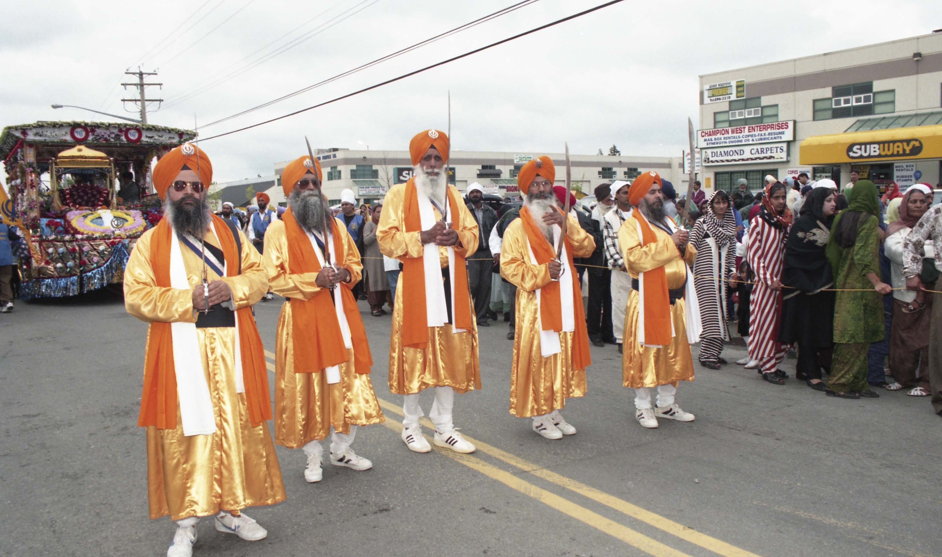 Photograph of unidentified individuals, known as gursikhs, holding swords at the Miri Piri Nagar Kirtan which took place in Surrey, British Columbia (B.C.). Gursikhs are Sikhs devoted to the Guru and the teachings of Sikhi. The Miri Piri Nagar Kirtan is an annual event which takes place in Surrey and is organized by the Guru Nanak Sikh Gurdwara (Temple).