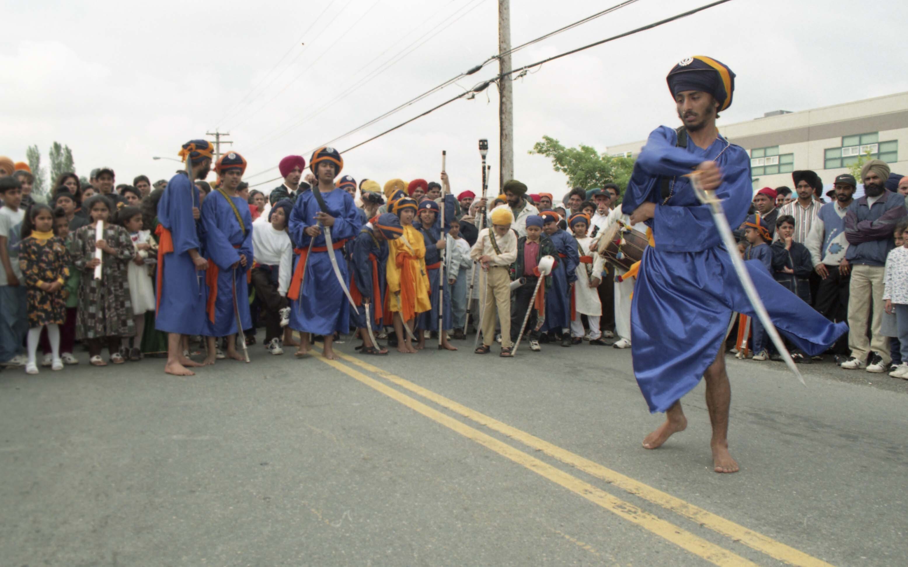 Photograph of an unidentified individual performing gatka at the Miri Piri Nagar Kirtan which took place in Surrey, British Columbia (B.C.). The Miri Piri Nagar Kirtan is an annual event which takes place in Surrey and is organized by the Guru Nanak Sikh Gurdwara (Temple).