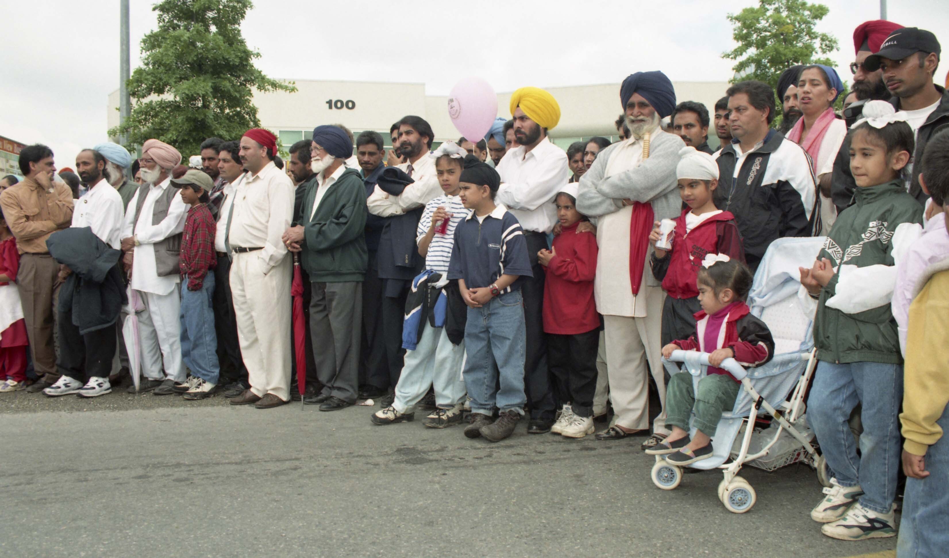 Photograph of a group of unidentified individuals at the Miri Piri Nagar Kirtan which took place in Surrey, British Columbia (B.C.). The Miri Piri Nagar Kirtan is an annual event which takes place in Surrey and is organized by the Guru Nanak Sikh Gurdwara (Temple).