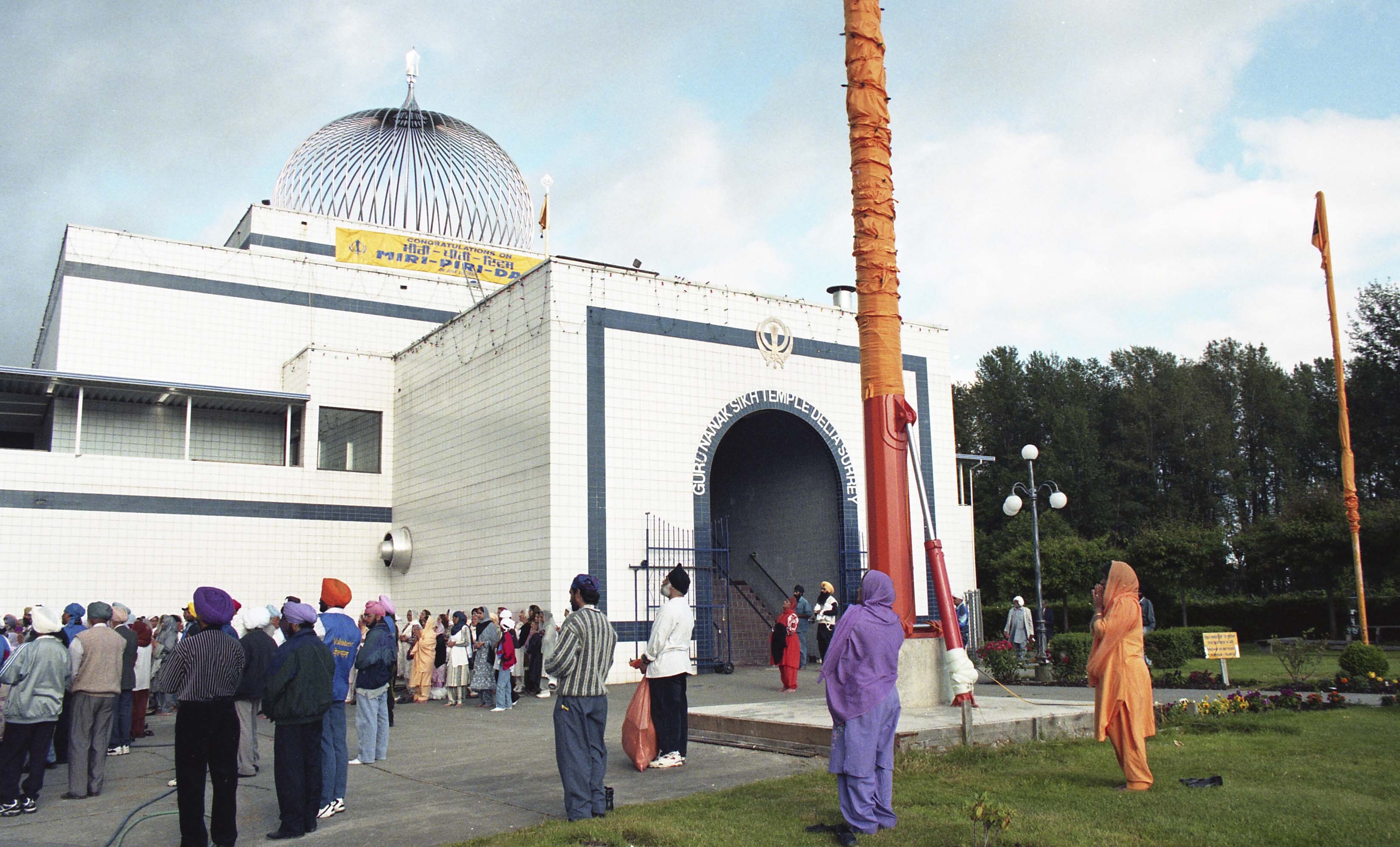 Photograph of a group of unidentified individuals at the Guru Nanak Sikh Gurdwara (Temple) in Surrey, British Columbia (B.C.). The group of individuals had gathered at the Sikh Temple for the Miri Piri Nagar Kirtan, which is an annual event that takes place in Surrey and is organized by the Guru Nanak Sikh Gurdwara (Temple).