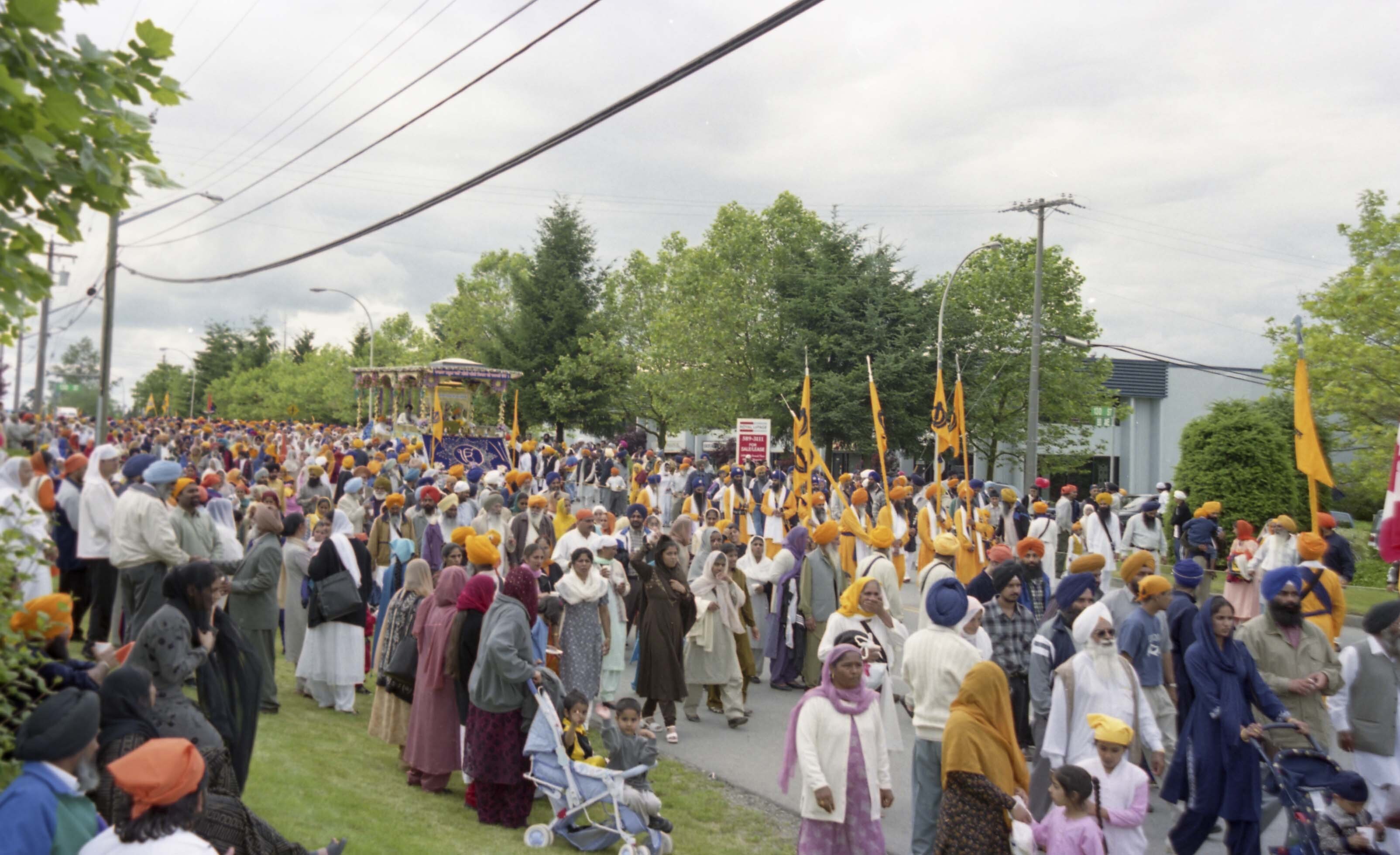 Photograph of a group of unidentified individuals at the Miri Piri Nagar Kirtan which took place in Surrey, British Columbia (B.C.). The Miri Piri Nagar Kirtan is an annual event which takes place in Surrey and is organized by the Guru Nanak Sikh Gurdwara (Temple).