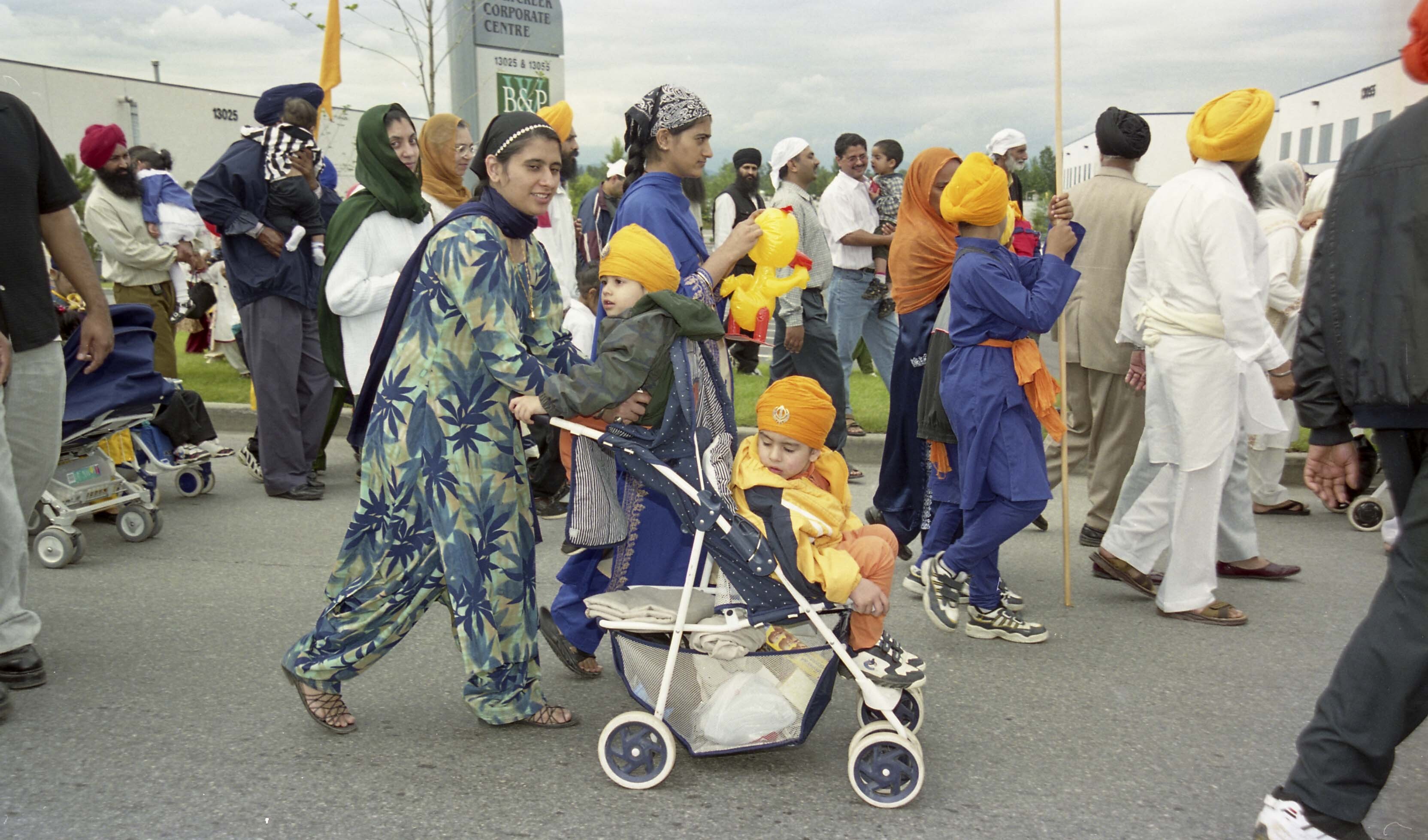 Photograph of a group of unidentified individuals at the Miri Piri Nagar Kirtan which took place in Surrey, British Columbia (B.C.). The Miri Piri Nagar Kirtan is an annual event which takes place in Surrey and is organized by the Guru Nanak Sikh Gurdwara (Temple).