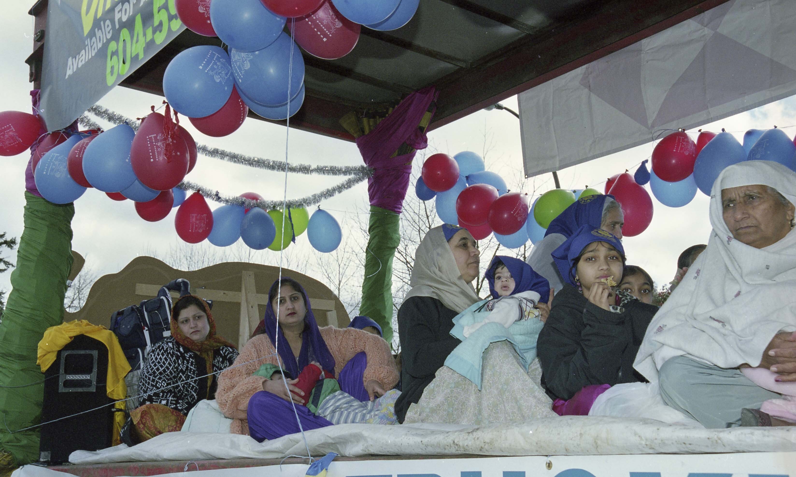 Photograph of a group of unidentified individuals on a float at the Vaisakhi Nagar Kirtan which took place in Vancouver, British Columbia (B.C.). The Vaisakhi Nagar Kirtan is an annual event which takes place in Vancouver and is organized by the Khalsa Diwan Society of Vancouver.