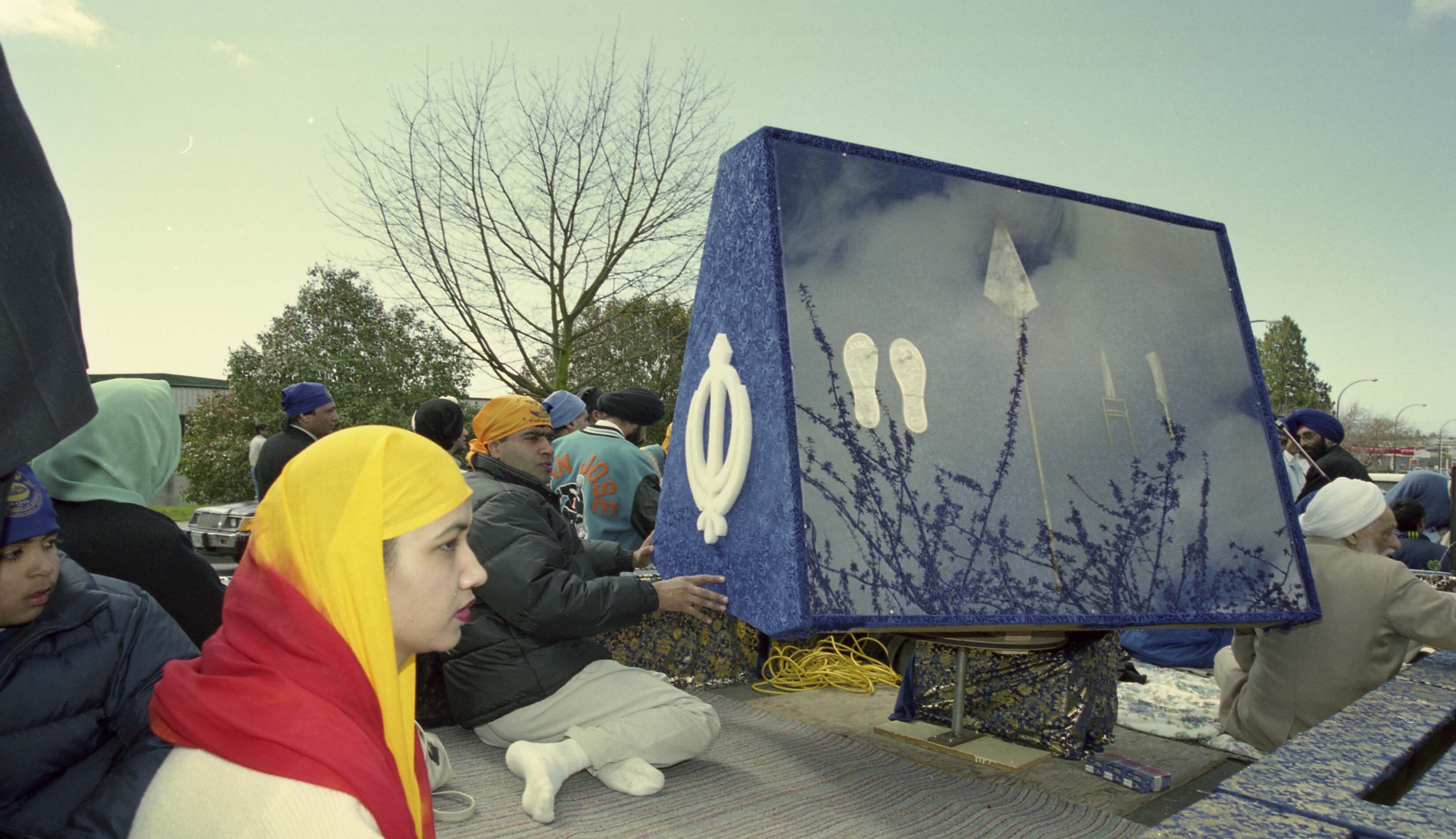 Photograph of unidentified individuals on a float at the Vaisakhi Nagar Kirtan which took place in Vancouver, British Columbia (B.C.). The Vaisakhi Nagar Kirtan is an annual event which takes place in Vancouver and is organized by the Khalsa Diwan Society of Vancouver.