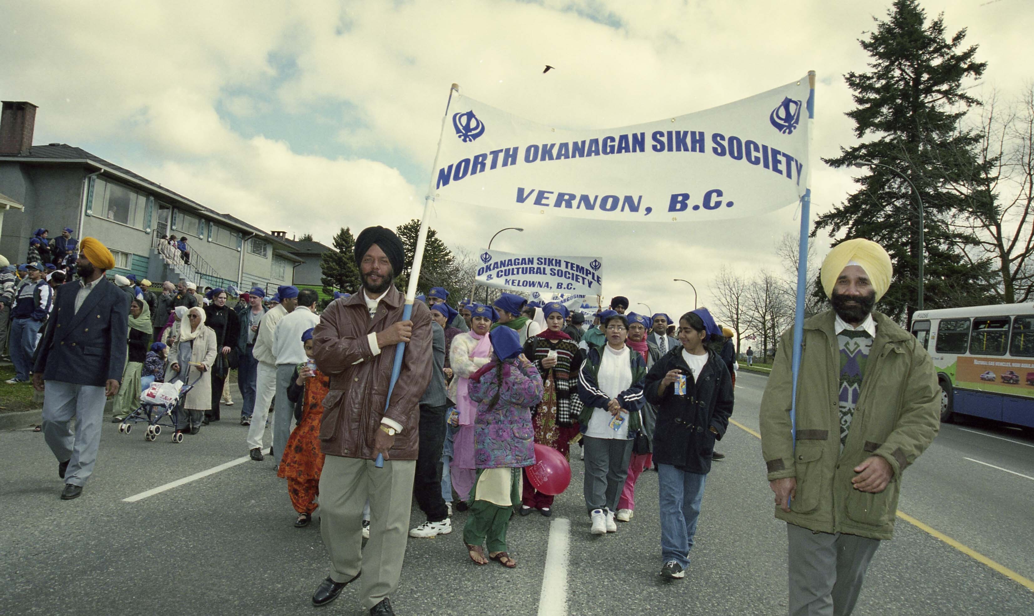Photograph of a group of unidentified individuals, some holding banners pertaining to Sikh societies, at the Vaisakhi Nagar Kirtan which took place in Vancouver, British Columbia (B.C.). The Vaisakhi Nagar Kirtan is an annual event which takes place in Vancouver and is organized by the Khalsa Diwan Society of Vancouver.