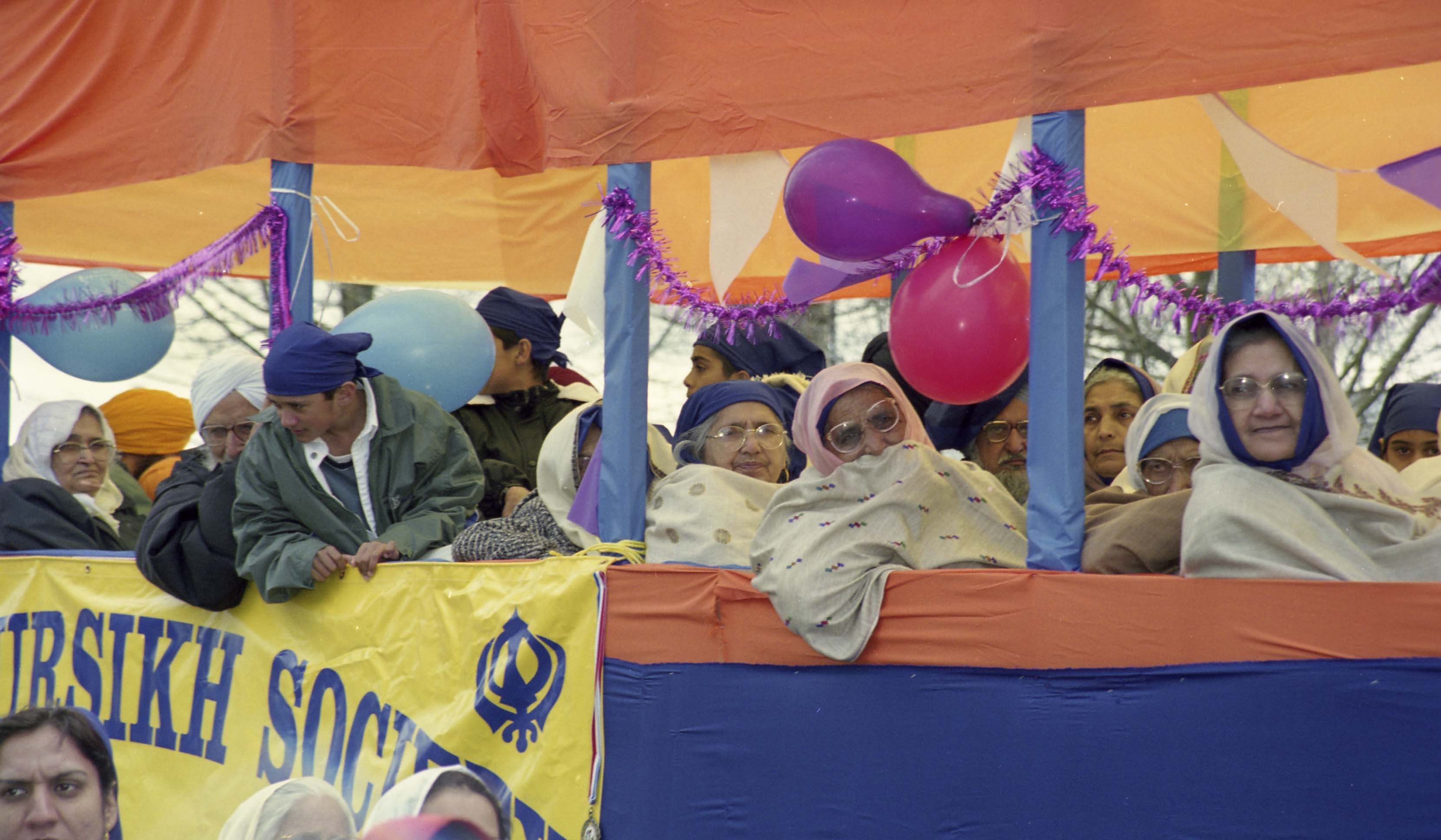 Photograph of a group of unidentified individuals on a float at the Vaisakhi Nagar Kirtan which took place in Vancouver, British Columbia (B.C.). The Vaisakhi Nagar Kirtan is an annual event which takes place in Vancouver and is organized by the Khalsa Diwan Society of Vancouver.