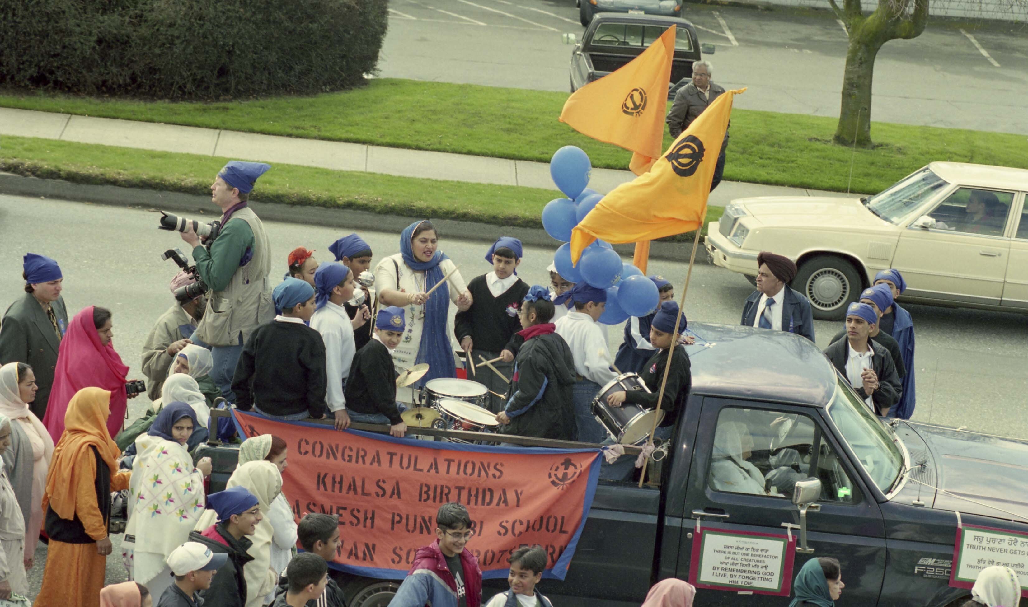 [Photograph of a group of individuals on a float at the Vaisakhi Nagar Kirtan in Vancouver]