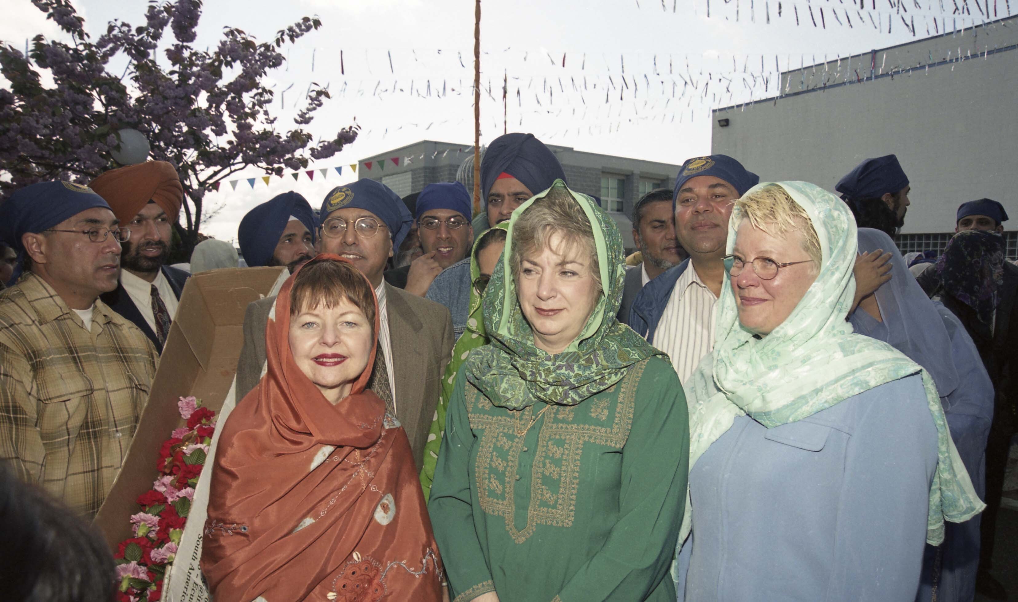 Photograph of Ujjal Dosanjh, Penny Priddy, and Sue Hammell with a group of unidentified individuals at the Vaisakhi Nagar Kirtan which took place in Vancouver, British Columbia (B.C.). The Vaisakhi Nagar Kirtan is an annual event which takes place in Vancouver and is organized by the Khalsa Diwan Society of Vancouver.