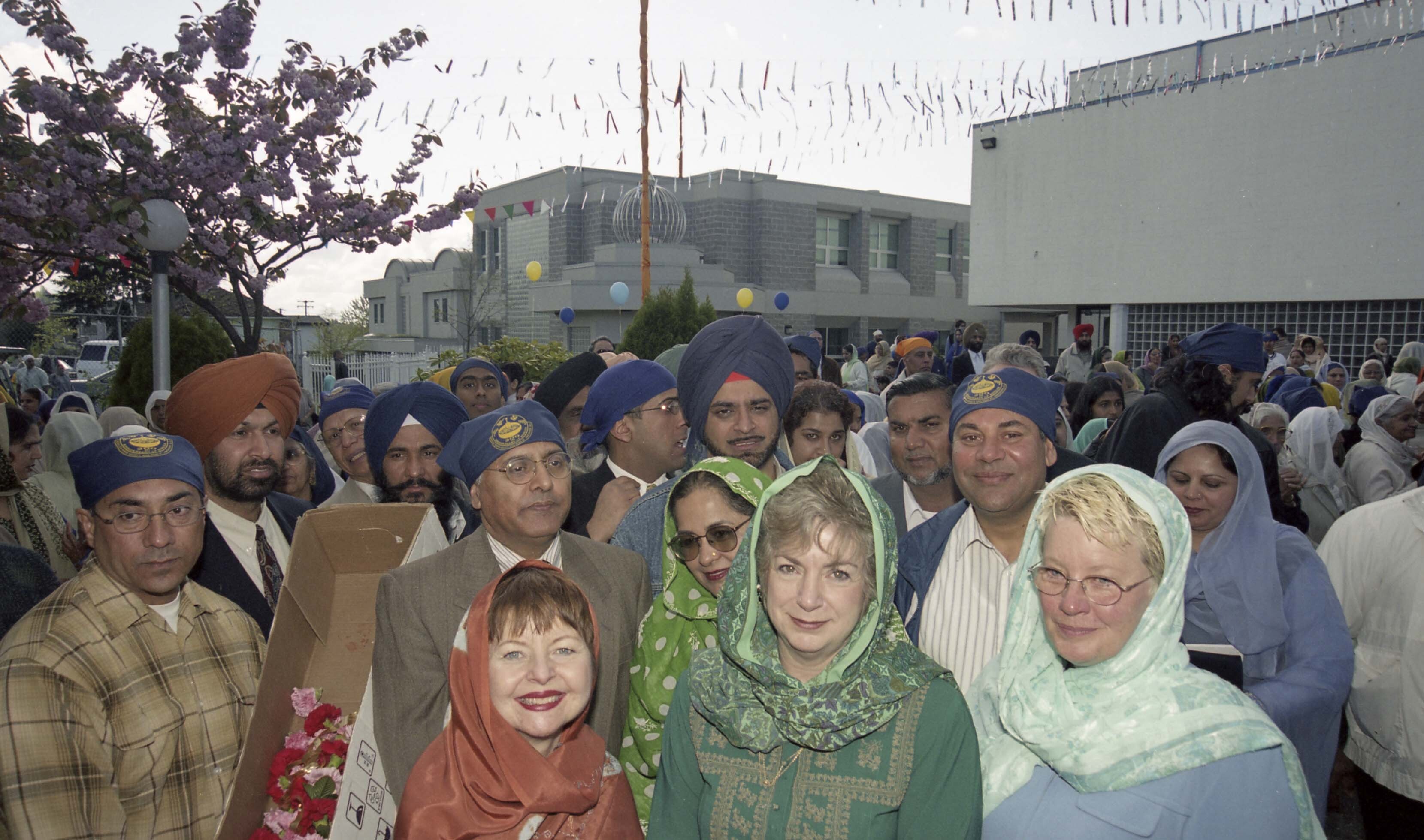 Photograph of Ujjal Dosanjh, Raminder Dosanjh, Penny Priddy, and Sue Hammell with a group of unidentified individuals at the Vaisakhi Nagar Kirtan which took place in Vancouver, British Columbia (B.C.). The Vaisakhi Nagar Kirtan is an annual event which takes place in Vancouver and is organized by the Khalsa Diwan Society of Vancouver.