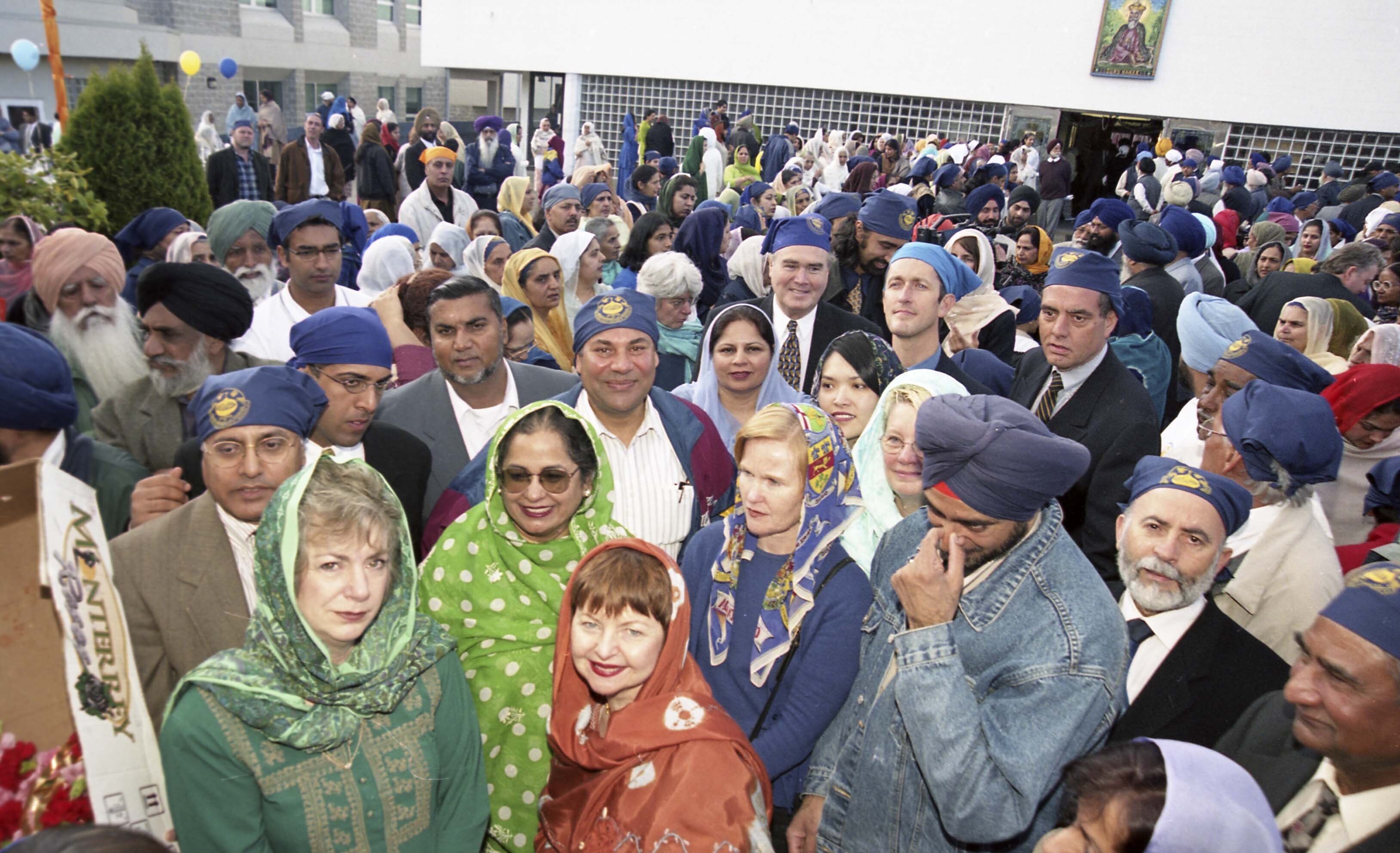 Photograph of Ujjal Dosanjh, Raminder Dosanjh, Penny Priddy, and Sue Hammell with a group of unidentified individuals at the Vaisakhi Nagar Kirtan which took place in Vancouver, British Columbia (B.C.). The Vaisakhi Nagar Kirtan is an annual event which takes place in Vancouver and is organized by the Khalsa Diwan Society of Vancouver.