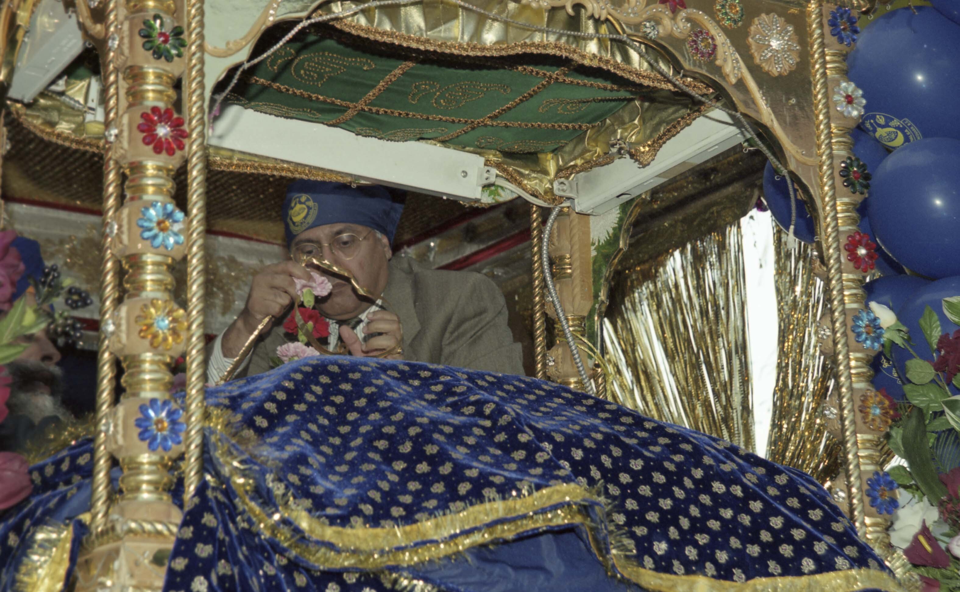Photograph of Ujjal Dosanjh on a float with the Guru Granth Sahib at the Vaisakhi Nagar Kirtan which took place in Vancouver, British Columbia (B.C.). The Vaisakhi Nagar Kirtan is an annual event which takes place in Vancouver and is organized by the Khalsa Diwan Society of Vancouver.