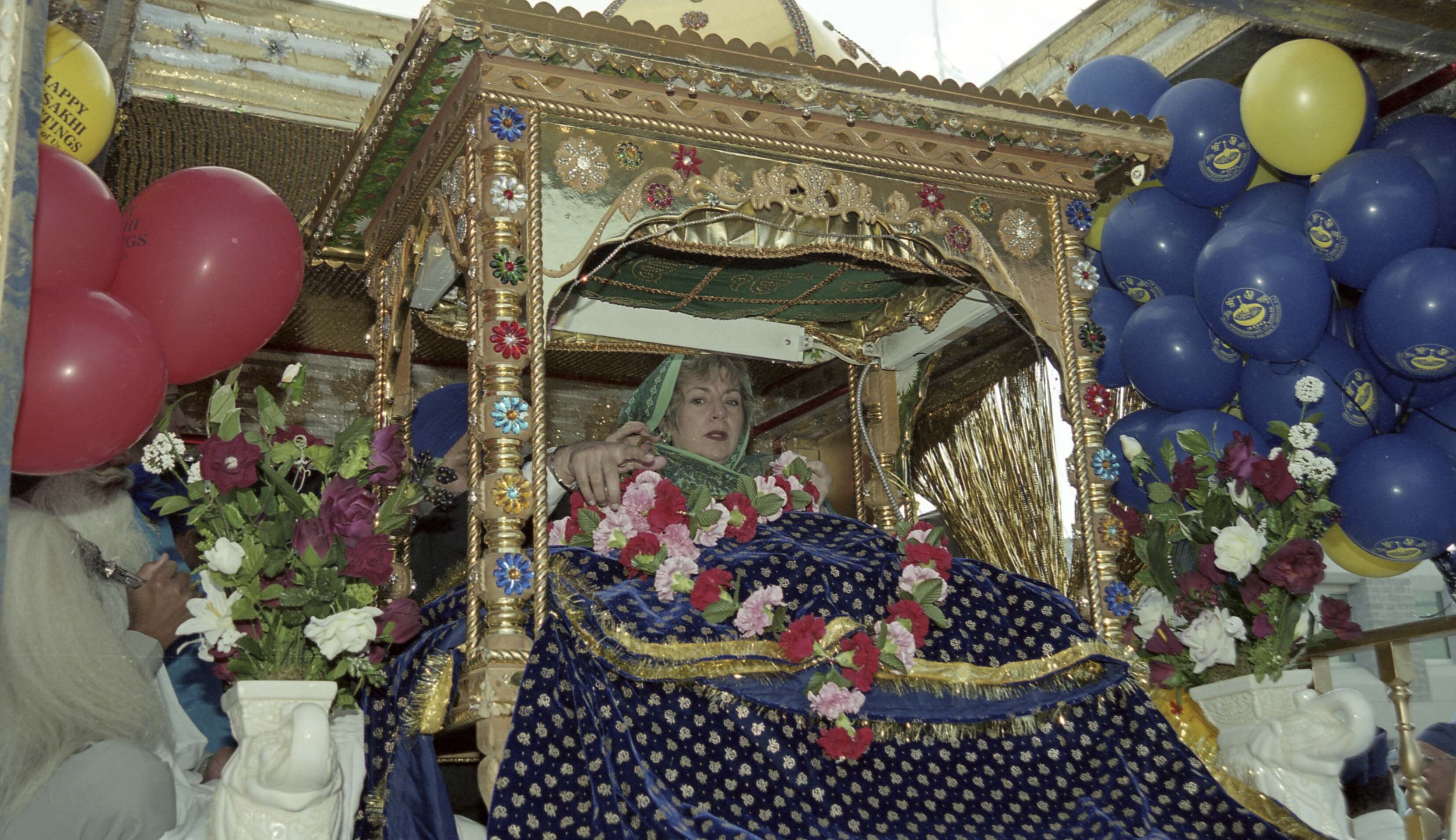 Photograph of Sue Hammell on a float with the Guru Granth Sahib at the Vaisakhi Nagar Kirtan which took place in Vancouver, British Columbia (B.C.). The Vaisakhi Nagar Kirtan is an annual event which takes place in Vancouver and is organized by the Khalsa Diwan Society of Vancouver.