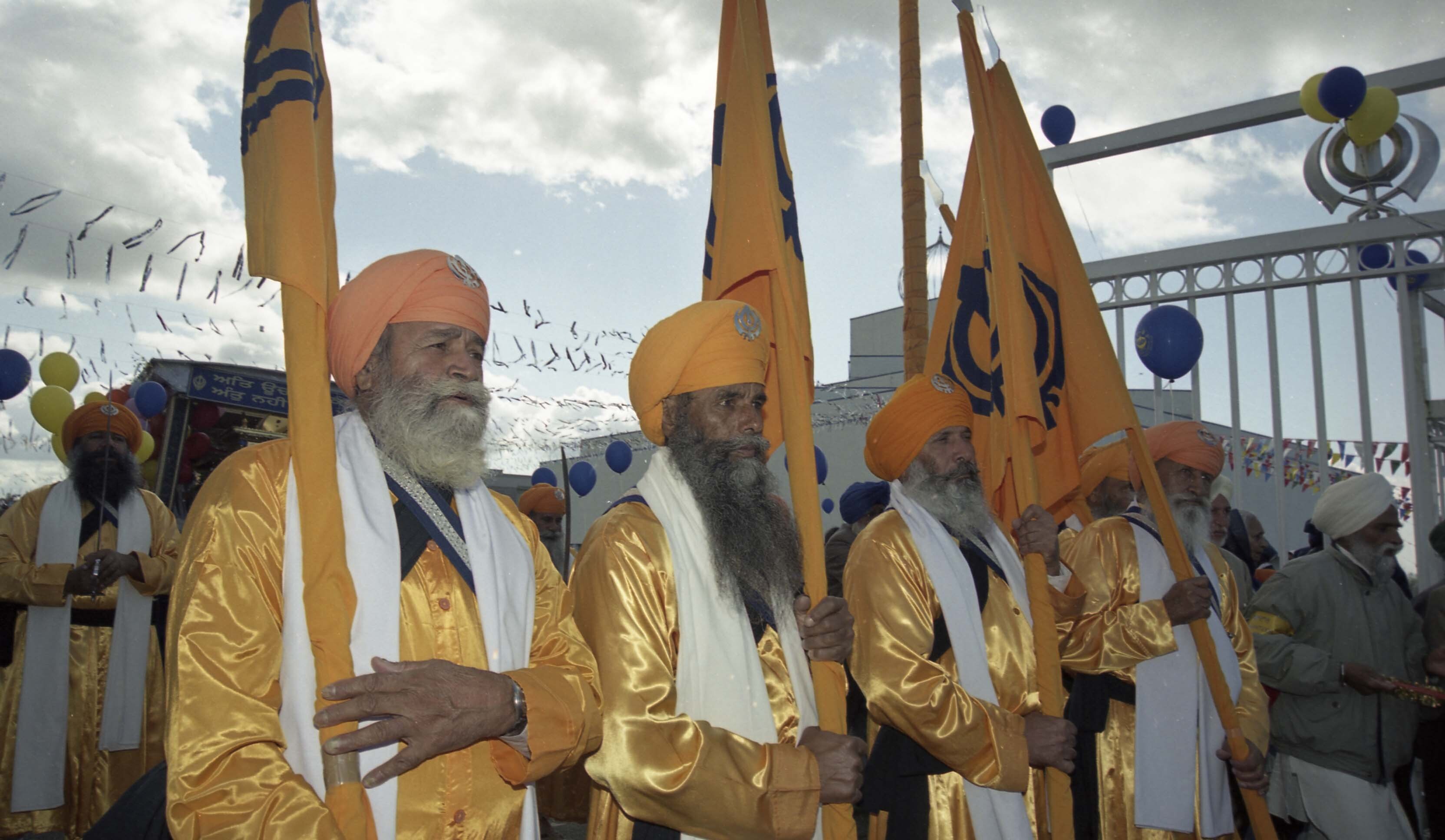 Photograph of a group of unidentified individuals, known as gursikhs, holding the nishan sahib flag at the Vaisakhi Nagar Kirtan which took place in Vancouver, British Columbia (B.C.). The Vaisakhi Nagar Kirtan is an annual event which takes place in Vancouver and is organized by the Khalsa Diwan Society of Vancouver.