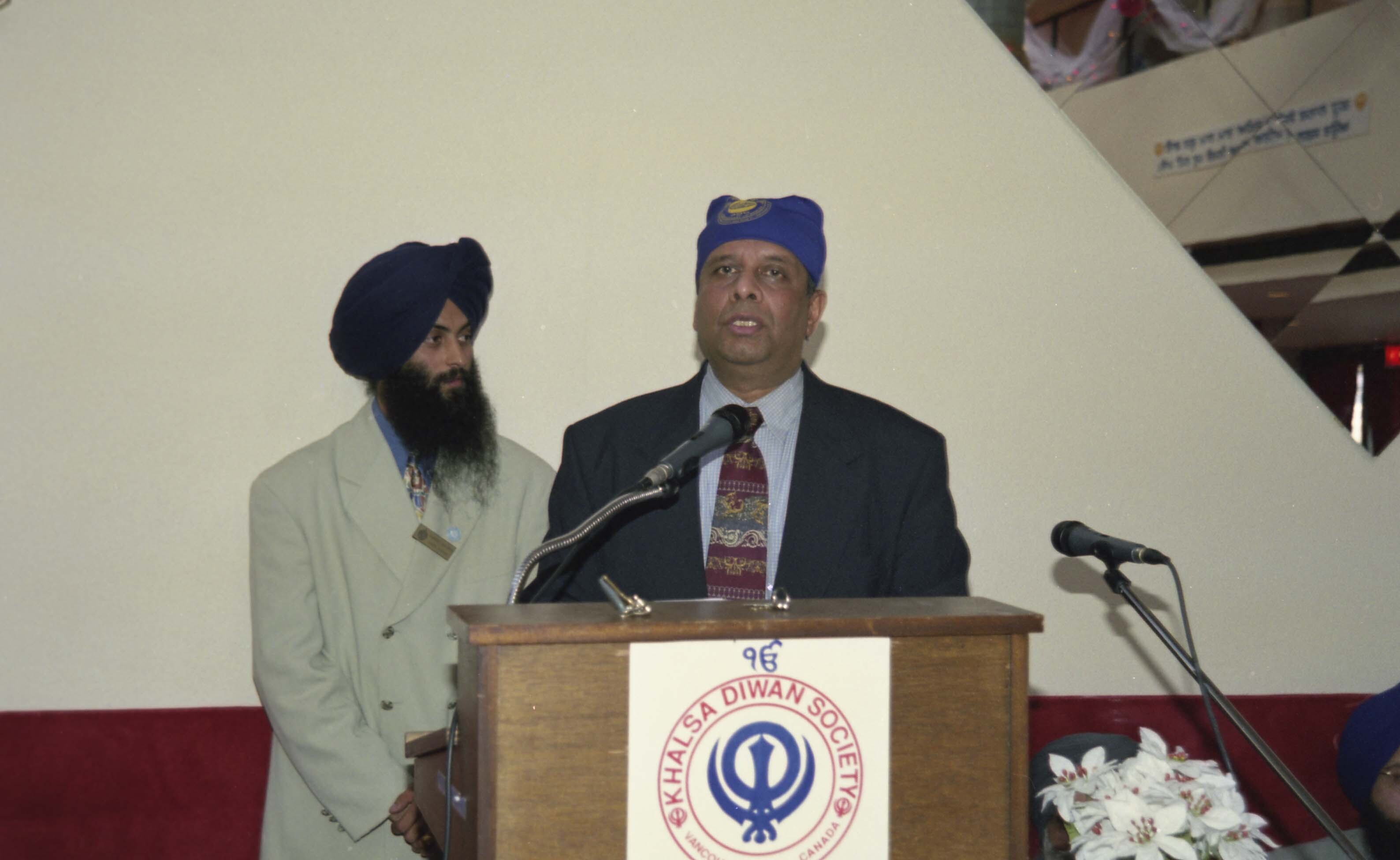 [Photograph of a speaker at the Sikh temple in Vancouver]
