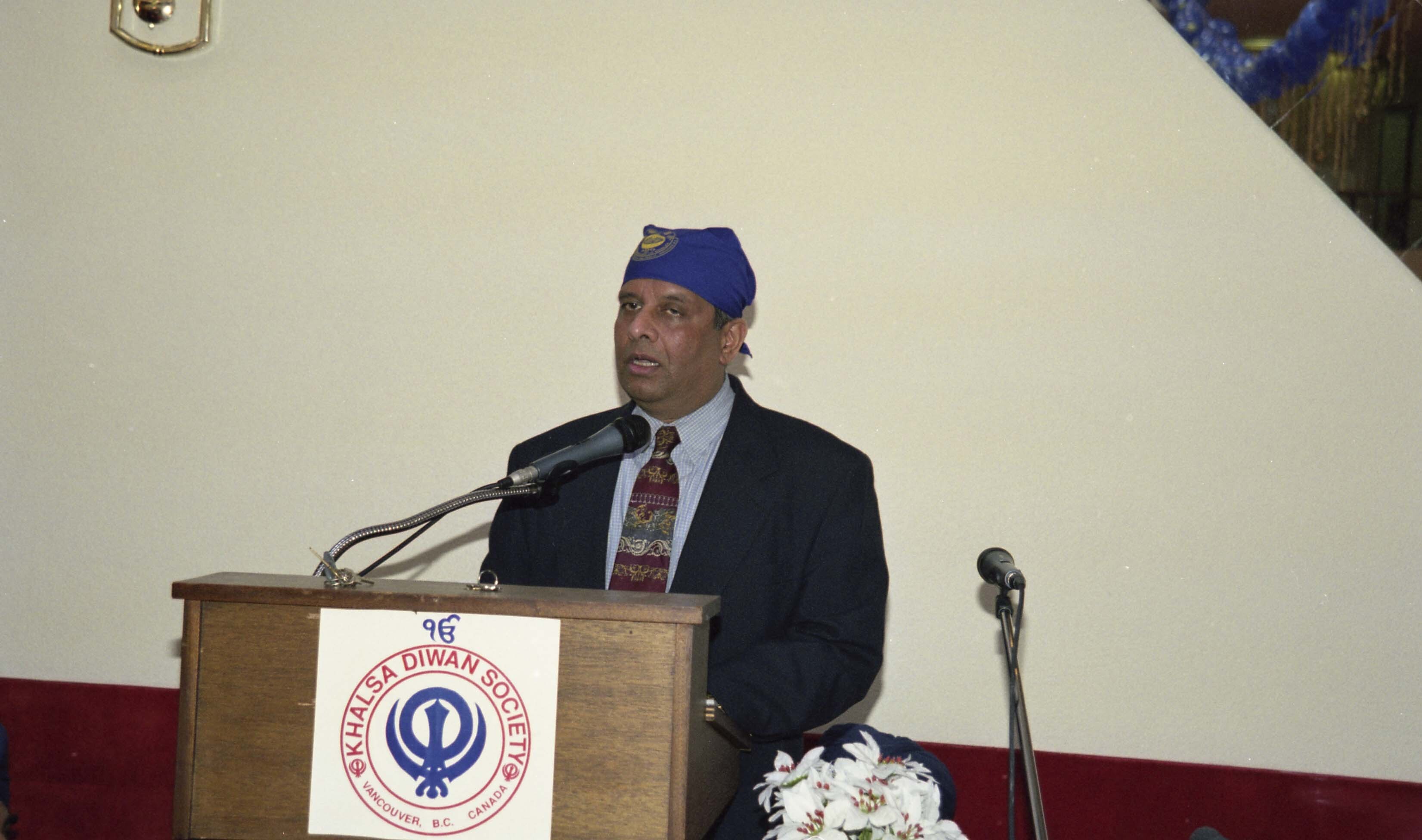 Photograph of an unidentified individual addressing the audience at the Sikh Temple (gurdwara) located in Vancouver, British Columbia (B.C.). Individuals had gathered at the Sikh Temple for the Vaisakhi Nagar Kirtan, an annual event hosted and organized by the Khalsa Diwan Society in Vancouver.
