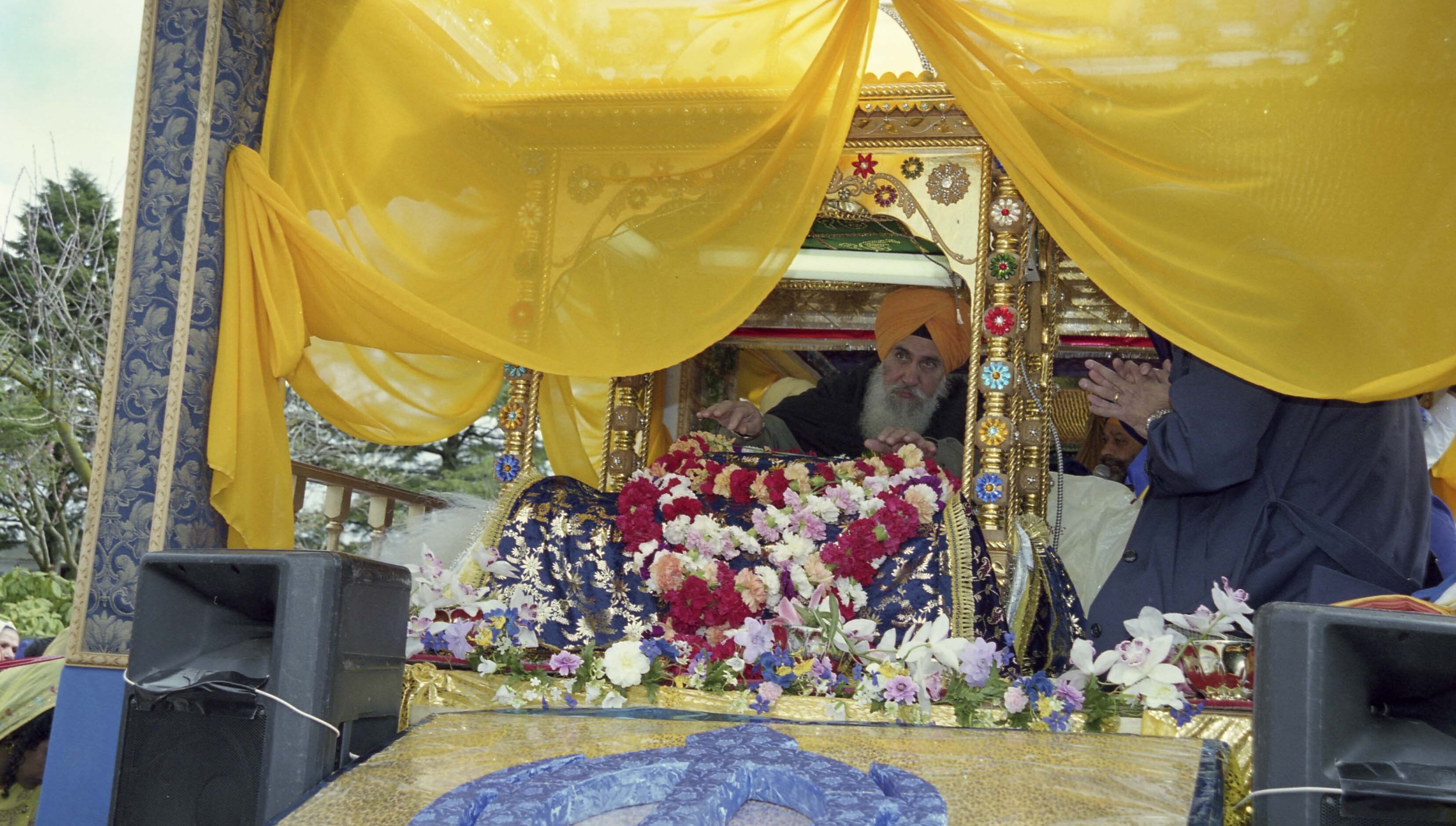 Photograph of an unidentified individual on a float with the Guru Granth Sahib at the Vaisakhi Nagar Kirtan which took place in Vancouver, British Columbia (B.C.). The Vaisakhi Nagar Kirtan is an annual event which takes place in Vancouver and is organized by the Khalsa Diwan Society of Vancouver.
