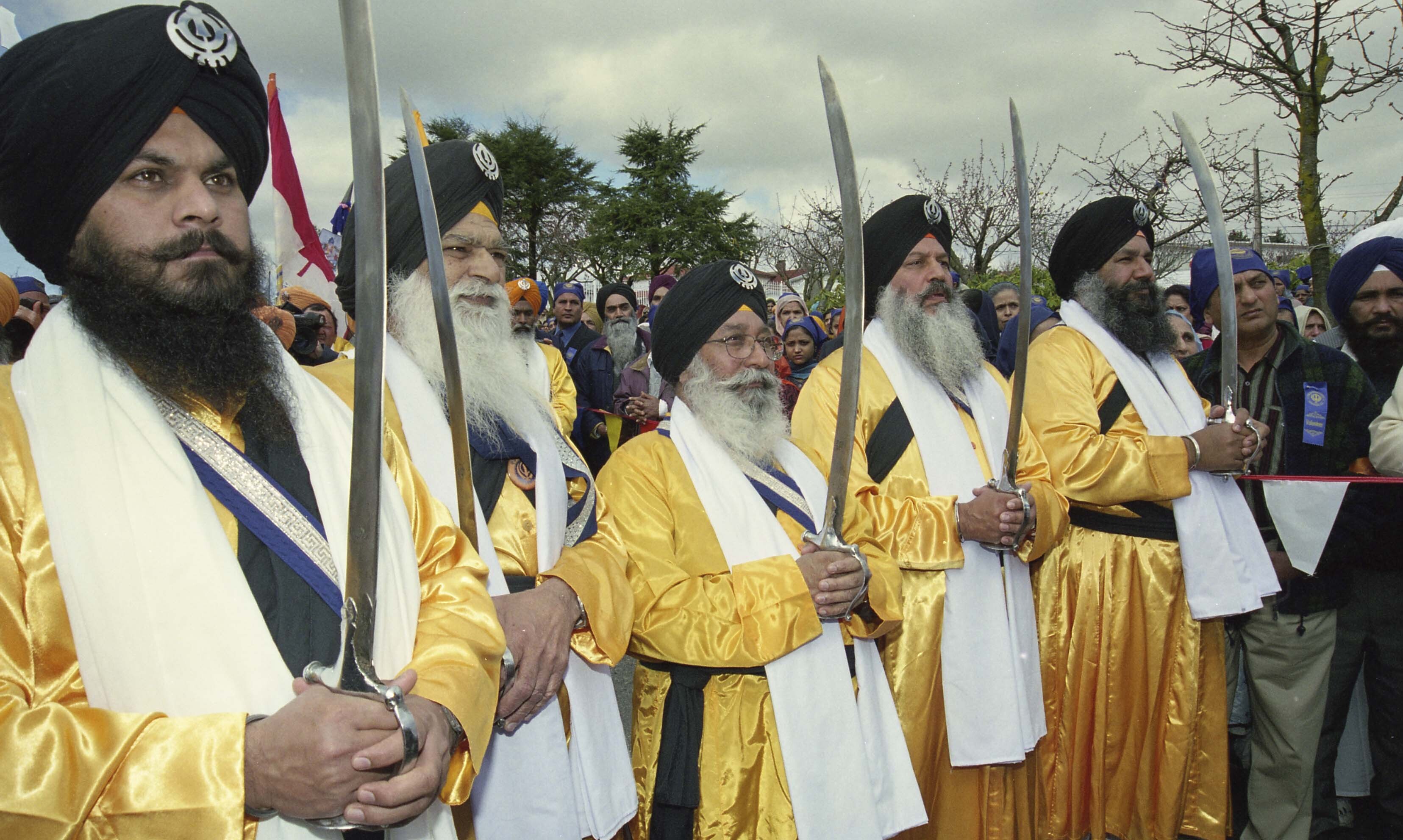 Photograph of a group of unidentified individuals, known as gursikhs, holding swords at the Vaisakhi Nagar Kirtan which took place in Vancouver, British Columbia (B.C.). Gursikhs are Sikhs devoted to the Guru and the teachings of Sikhi. The Vaisakhi Nagar Kirtan is an annual event which takes place in Vancouver and is organized by the Khalsa Diwan Society of Vancouver.