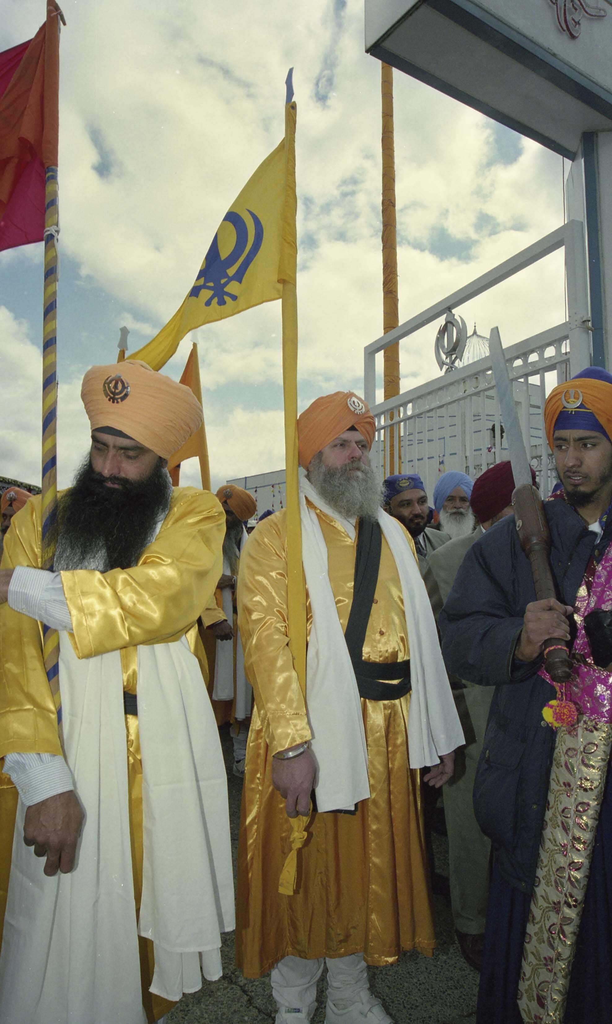 Photograph of a group of unidentified individuals, known as gursikhs and nihangs, at the Vaisakhi Nagar Kirtan which took place in Vancouver, British Columbia (B.C.). The Vaisakhi Nagar Kirtan is an annual event which takes place in Vancouver and is organized by the Khalsa Diwan Society of Vancouver.