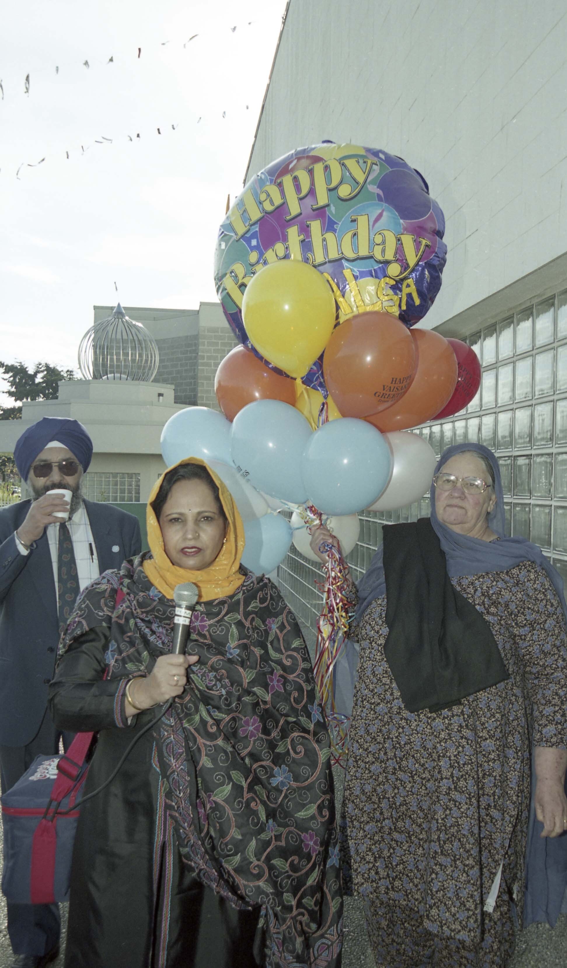 Photograph of unidentified individuals at the Sikh Temple (gurdwara) located in Vancouver, British Columbia (B.C.). Individuals had gathered at the Sikh Temple for the Vaisakhi Nagar Kirtan, an annual event hosted and organized by the Khalsa Diwan Society in Vancouver.