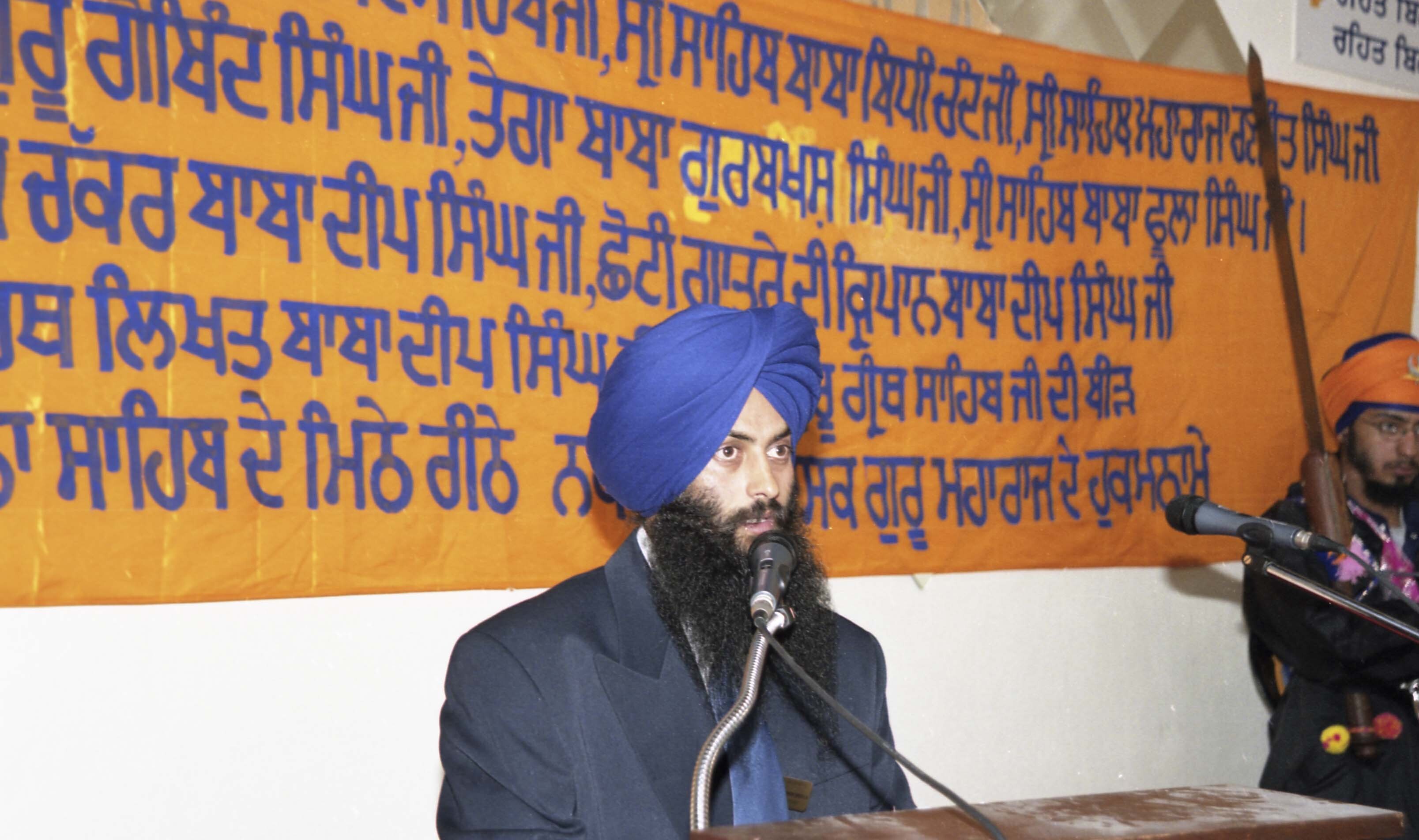 [Photograph of a speaker at the Sikh temple in Vancouver]