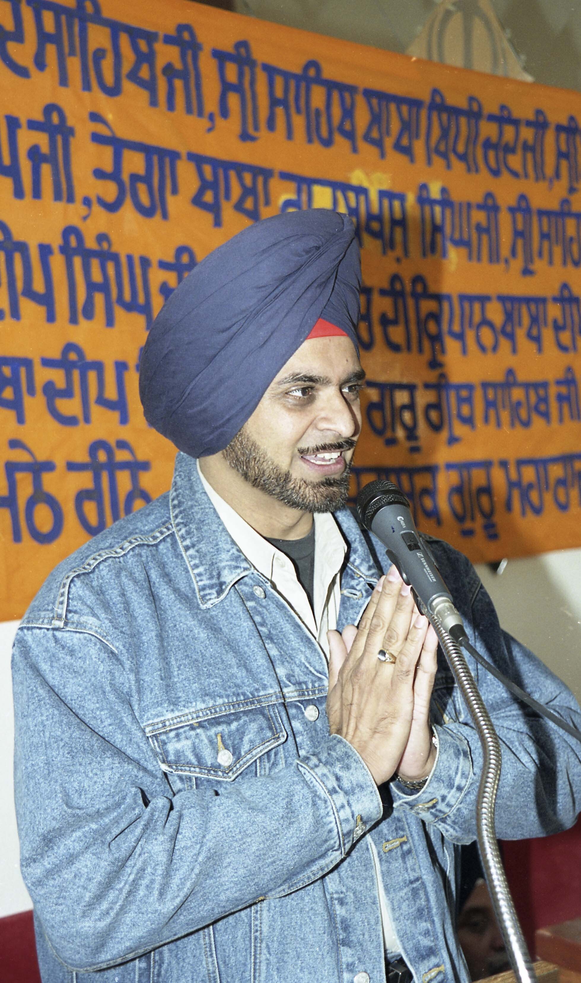 Photograph of an unidentified individual addressing the audience at the Sikh Temple (gurdwara) located in Vancouver, British Columbia (B.C.). Individuals had gathered at the Sikh Temple for the Vaisakhi Nagar Kirtan, an annual event hosted and organized by the Khalsa Diwan Society in Vancouver.