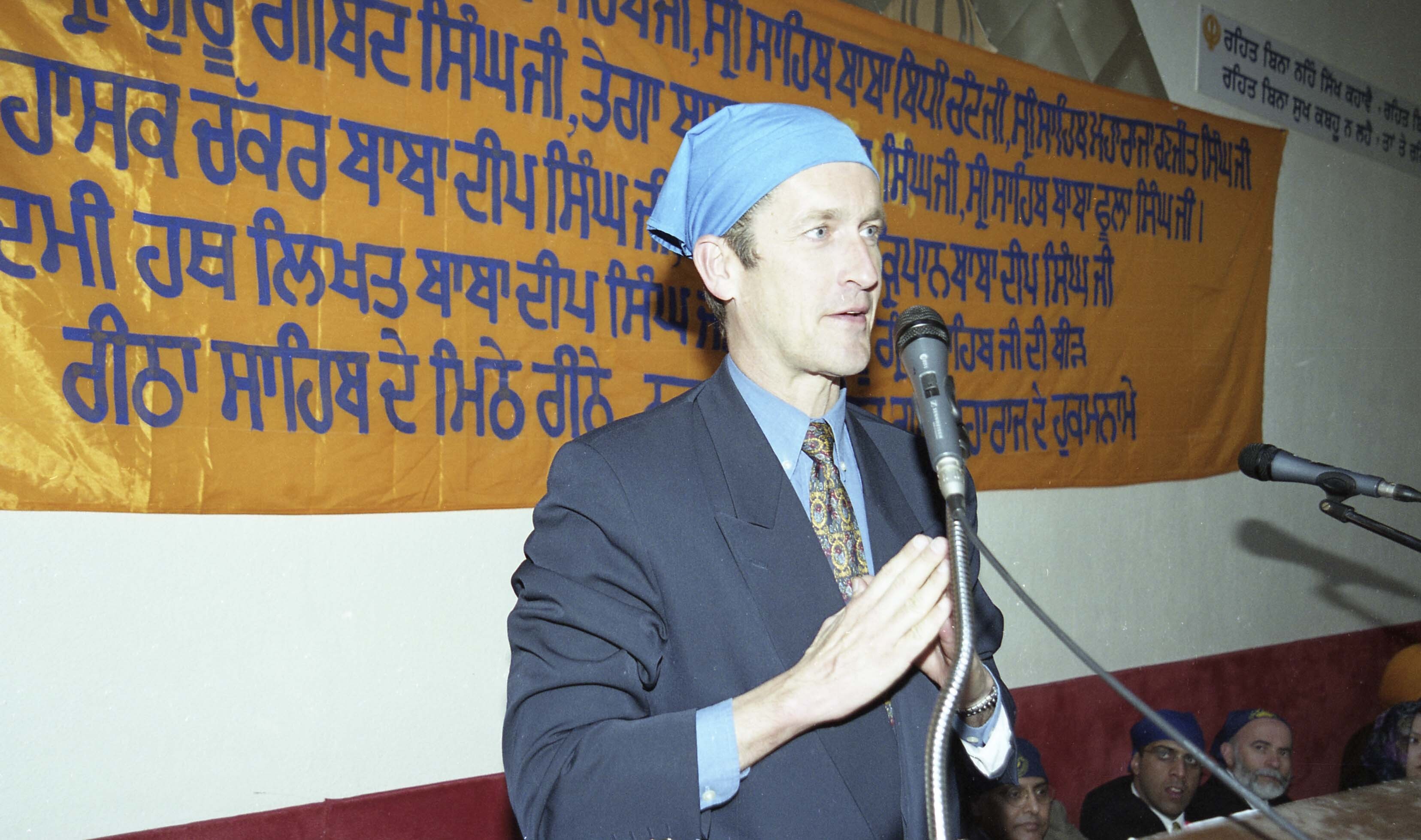 [Photograph of a speaker at the Sikh temple in Vancouver]