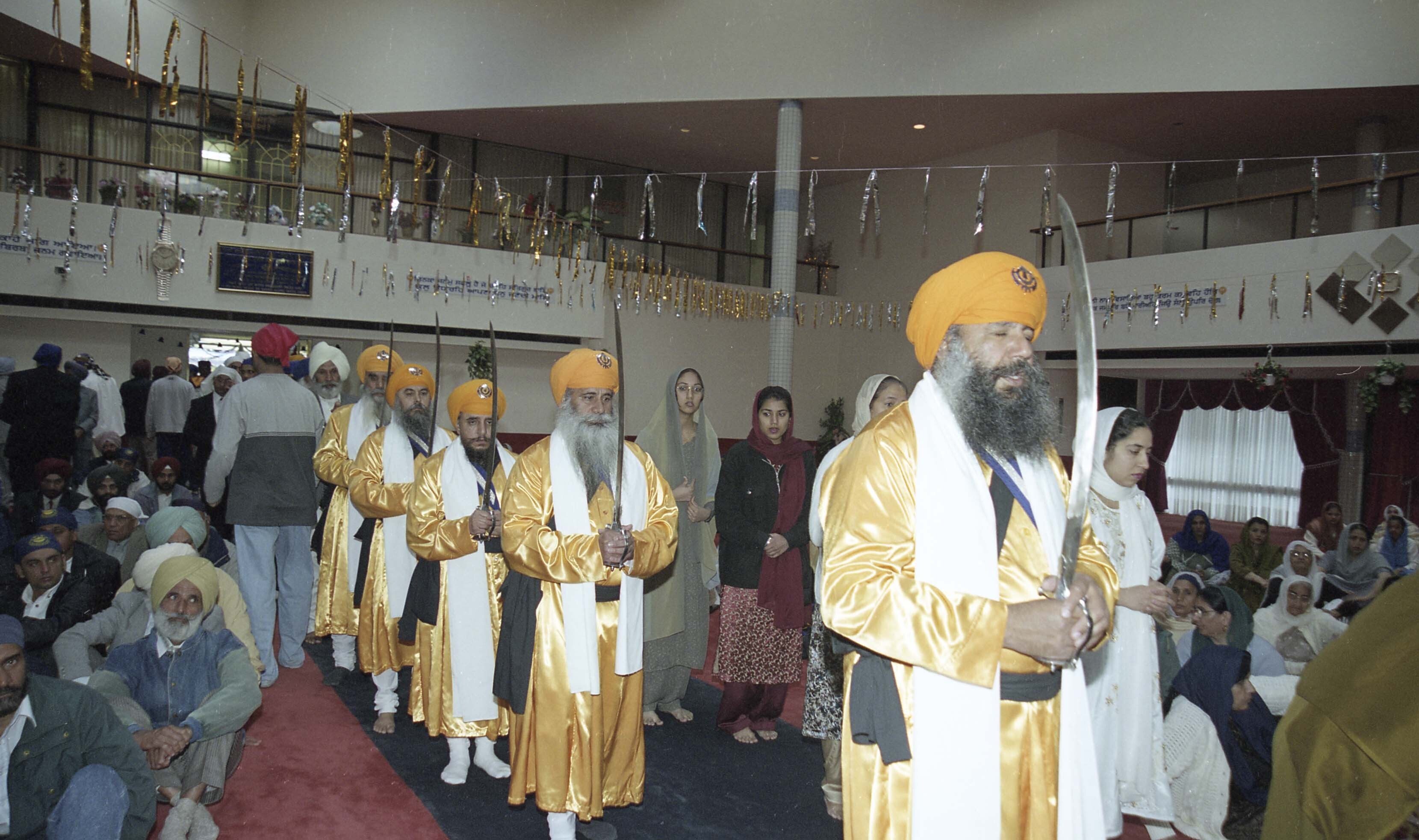 Photograph of a group of unidentified individuals, known as gursikhs, at the Sikh Temple (gurdwara) located in Vancouver, British Columbia (B.C.). Gursikhs are Sikhs devoted to the Guru and the teachings of Sikhi. Individuals had gathered at the Sikh Temple for the Vaisakhi Nagar Kirtan, an annual event hosted and organized by the Khalsa Diwan Society in Vancouver.