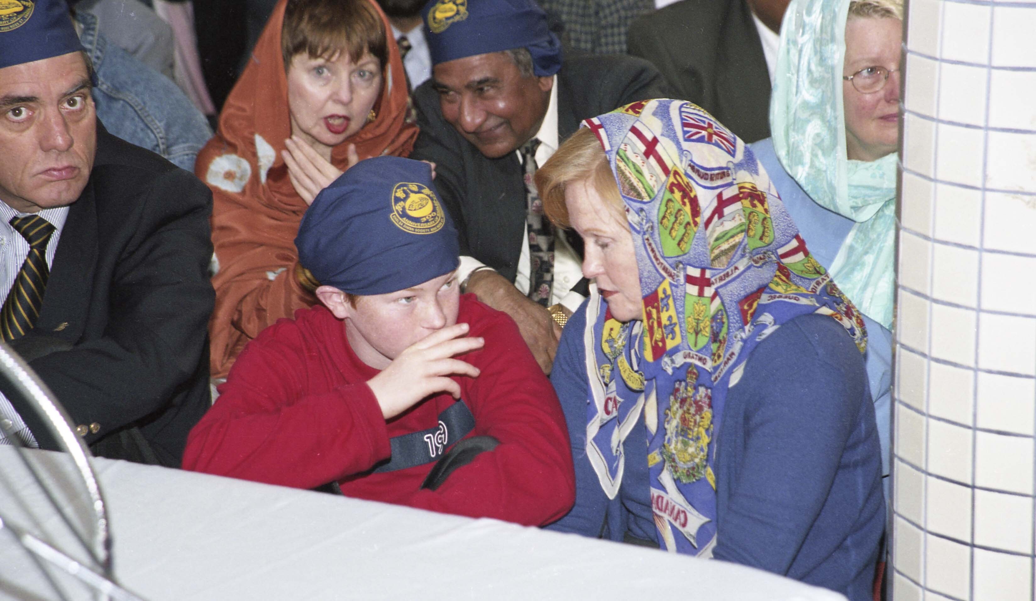 Photograph of a group of unidentified individuals at the Sikh Temple (gurdwara) located in Vancouver, British Columbia (B.C.). Individuals had gathered at the Sikh Temple for the Vaisakhi Nagar Kirtan, an annual event hosted and organized by the Khalsa Diwan Society in Vancouver. Among the group of individuals is Penny Priddy.
