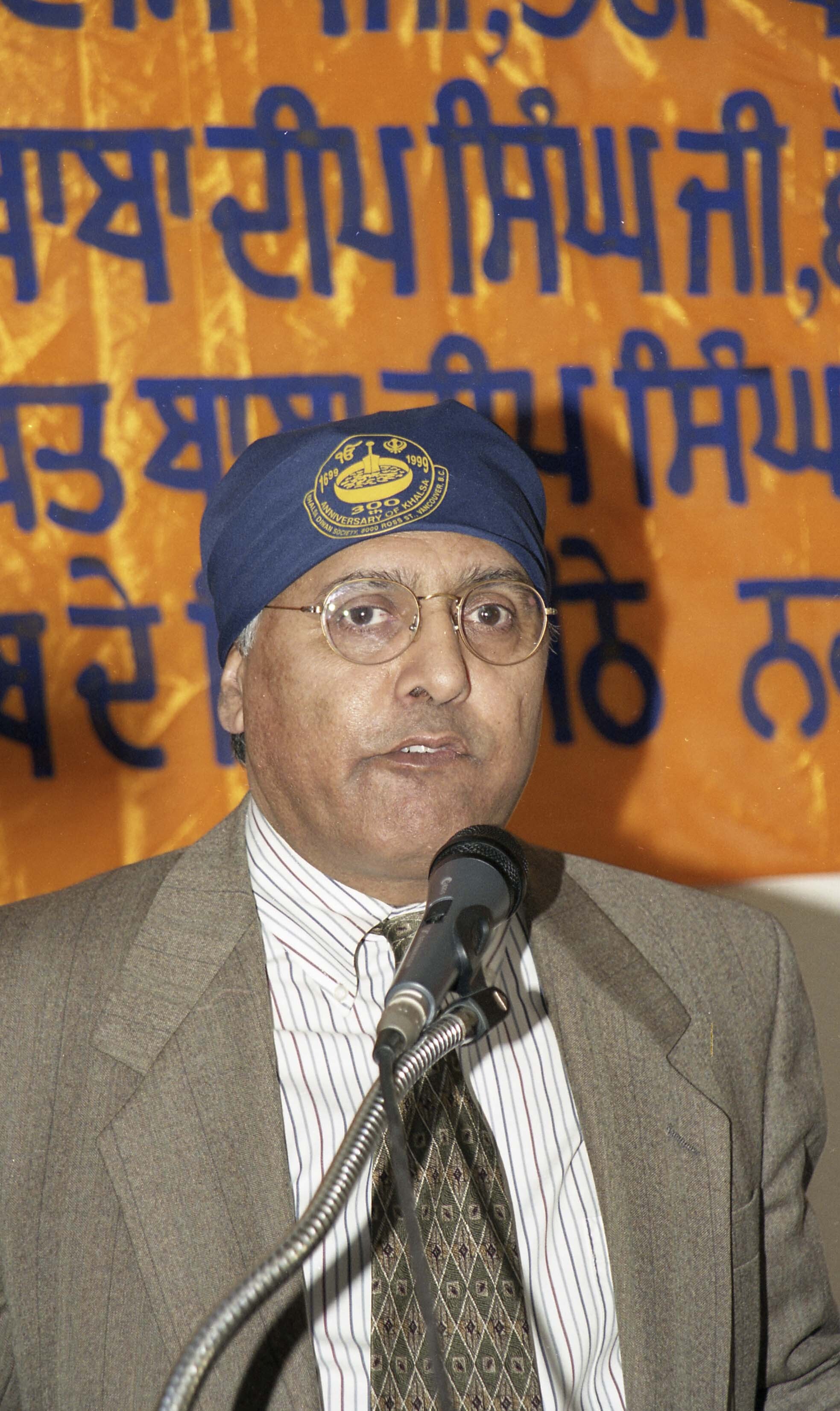 Photograph of Ujjal Dosanjh addressing the audience at the Sikh Temple (gurdwara) located in Vancouver, British Columbia (B.C.). Individuals had gathered at the Sikh Temple for the Vaisakhi Nagar Kirtan, an annual event hosted and organized by the Khalsa Diwan Society in Vancouver.