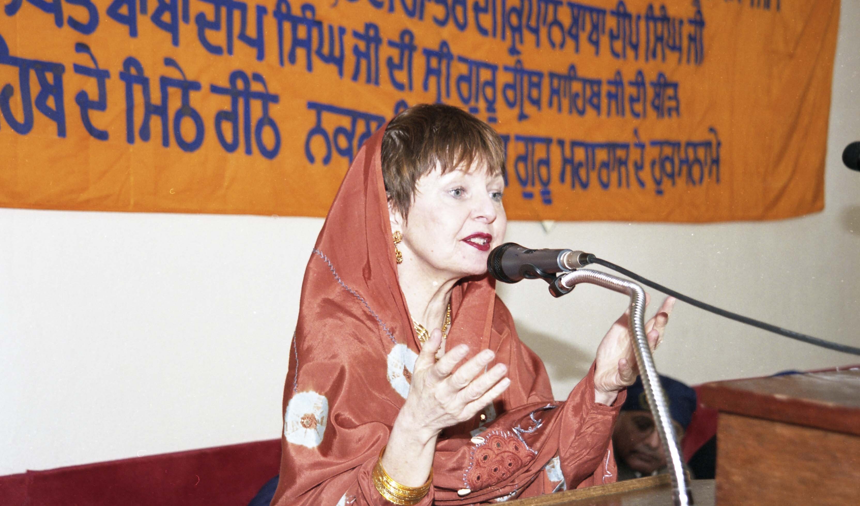 Photograph of Penny Priddy addressing the audience at the Sikh Temple (gurdwara) located in Vancouver, British Columbia (B.C.). Individuals had gathered at the Sikh Temple for the Vaisakhi Nagar Kirtan, an annual event hosted and organized by the Khalsa Diwan Society in Vancouver.