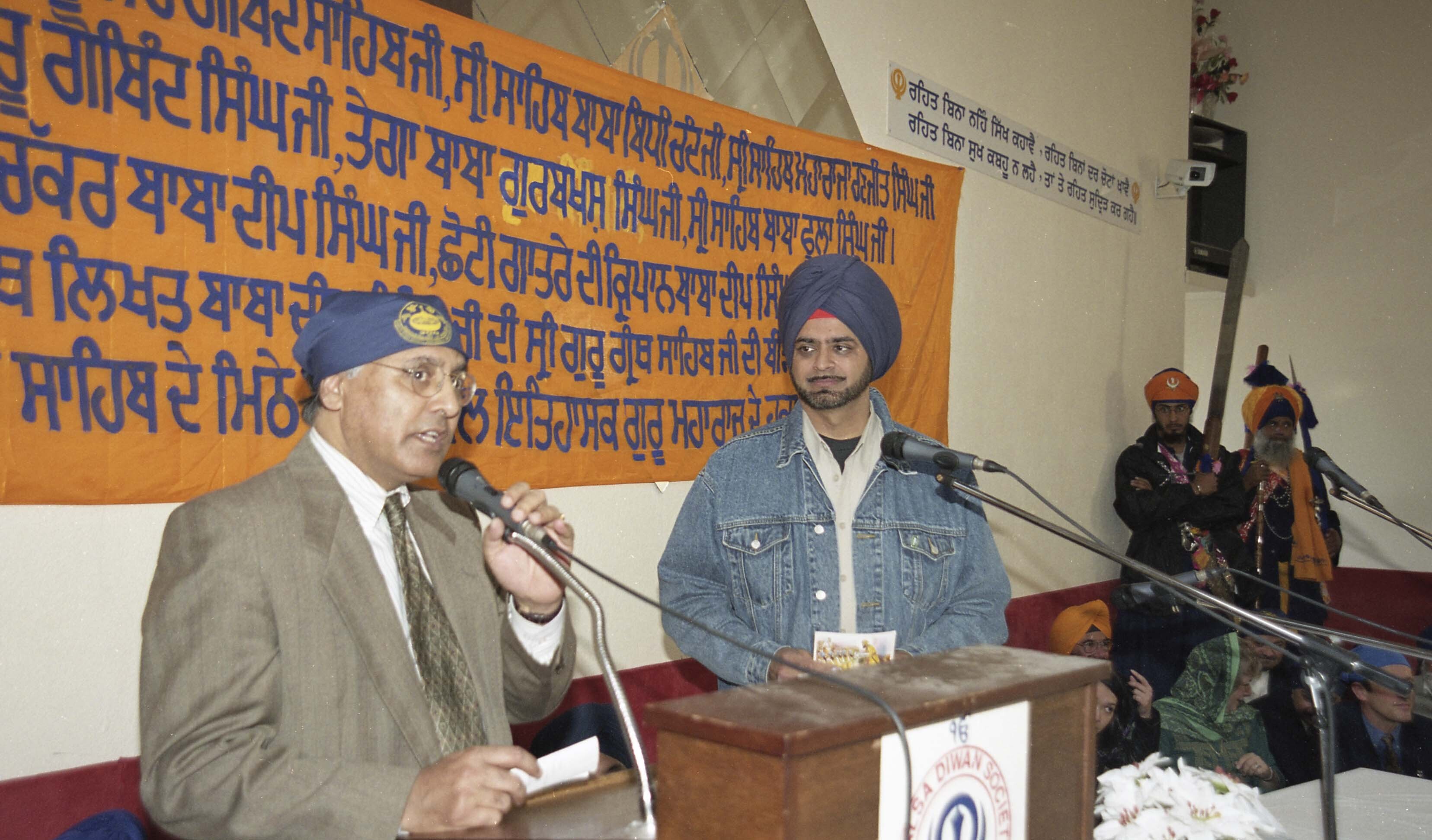 Photograph of Ujjal Dosanjh addressing the audience at the Sikh Temple (gurdwara) located in Vancouver, British Columbia (B.C.). Individuals had gathered at the Sikh Temple for the Vaisakhi Nagar Kirtan, an annual event hosted and organized by the Khalsa Diwan Society in Vancouver.