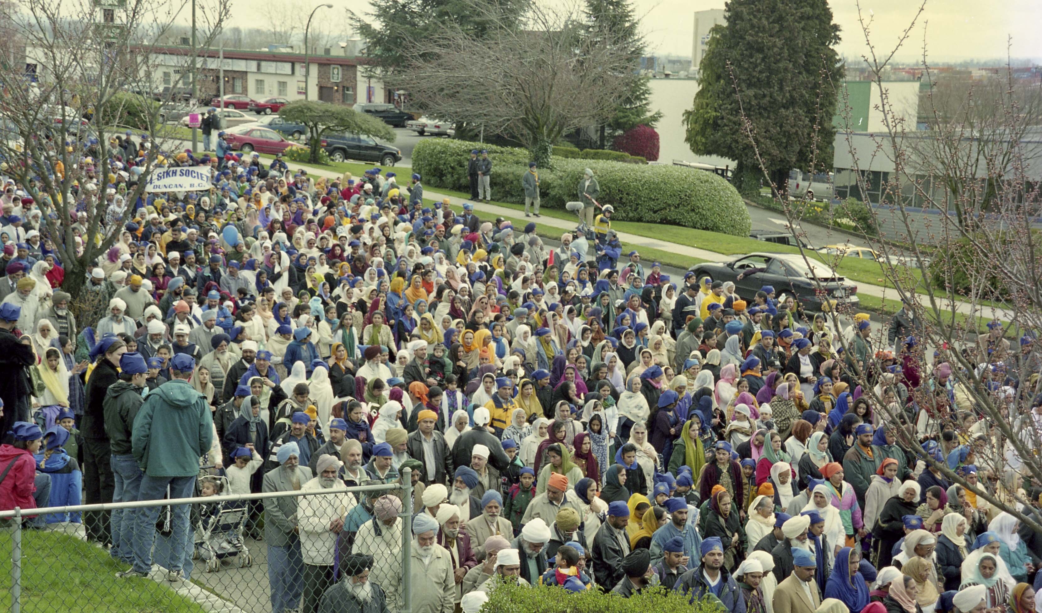 Photograph of a group of unidentified individuals at a Nagar Kirtan in Vancouver, British Columbia (B.C.). The Nagar Kirtan was organized by the Khalsa Diwan Society of Vancouver to commemorate the 300th anniversary of Khalsa.