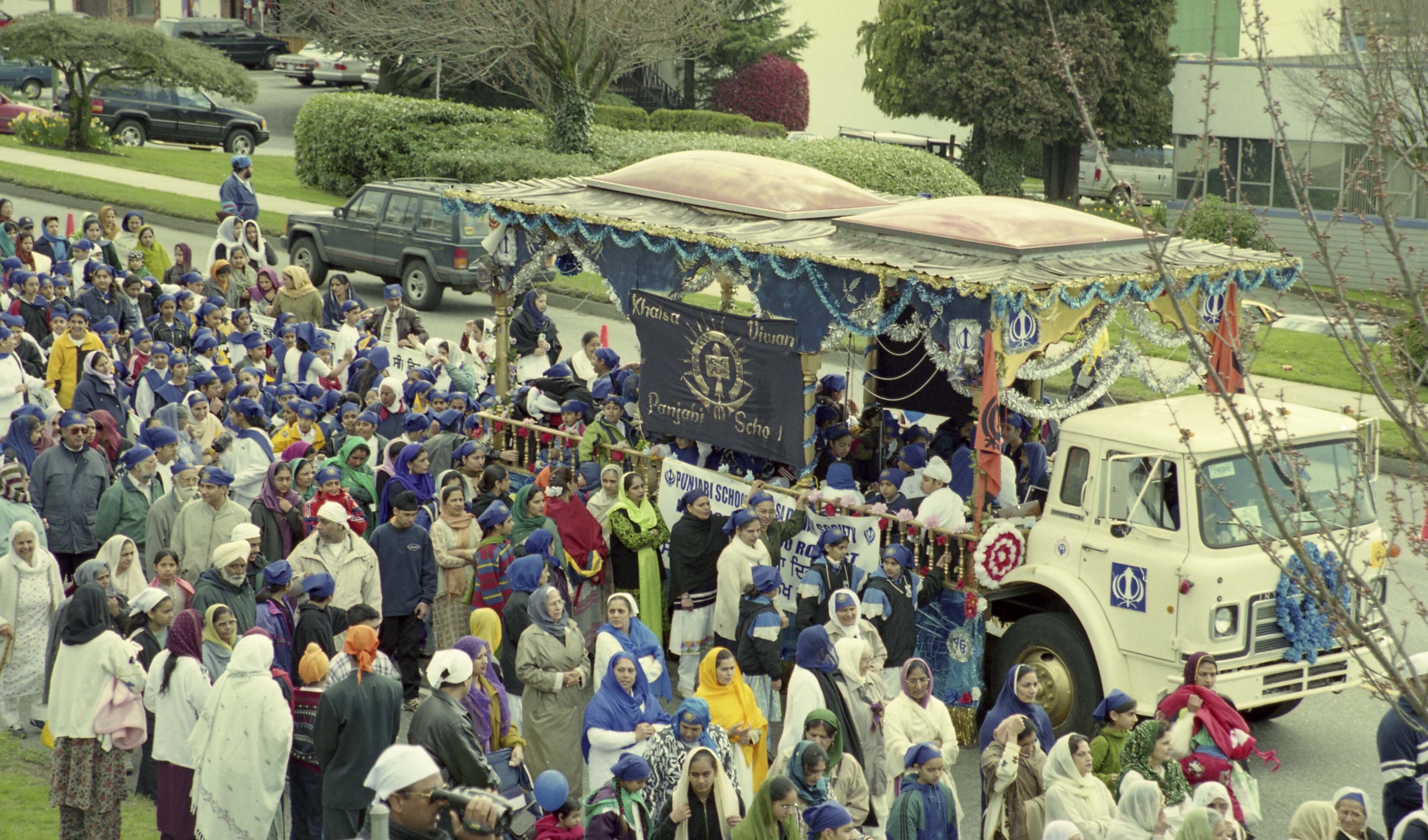 Photograph of a decorated float and a group of unidentified individuals at a Nagar Kirtan in Vancouver, British Columbia (B.C.). The Nagar Kirtan was organized by the Khalsa Diwan Society of Vancouver to commemorate the 300th anniversary of Khalsa.