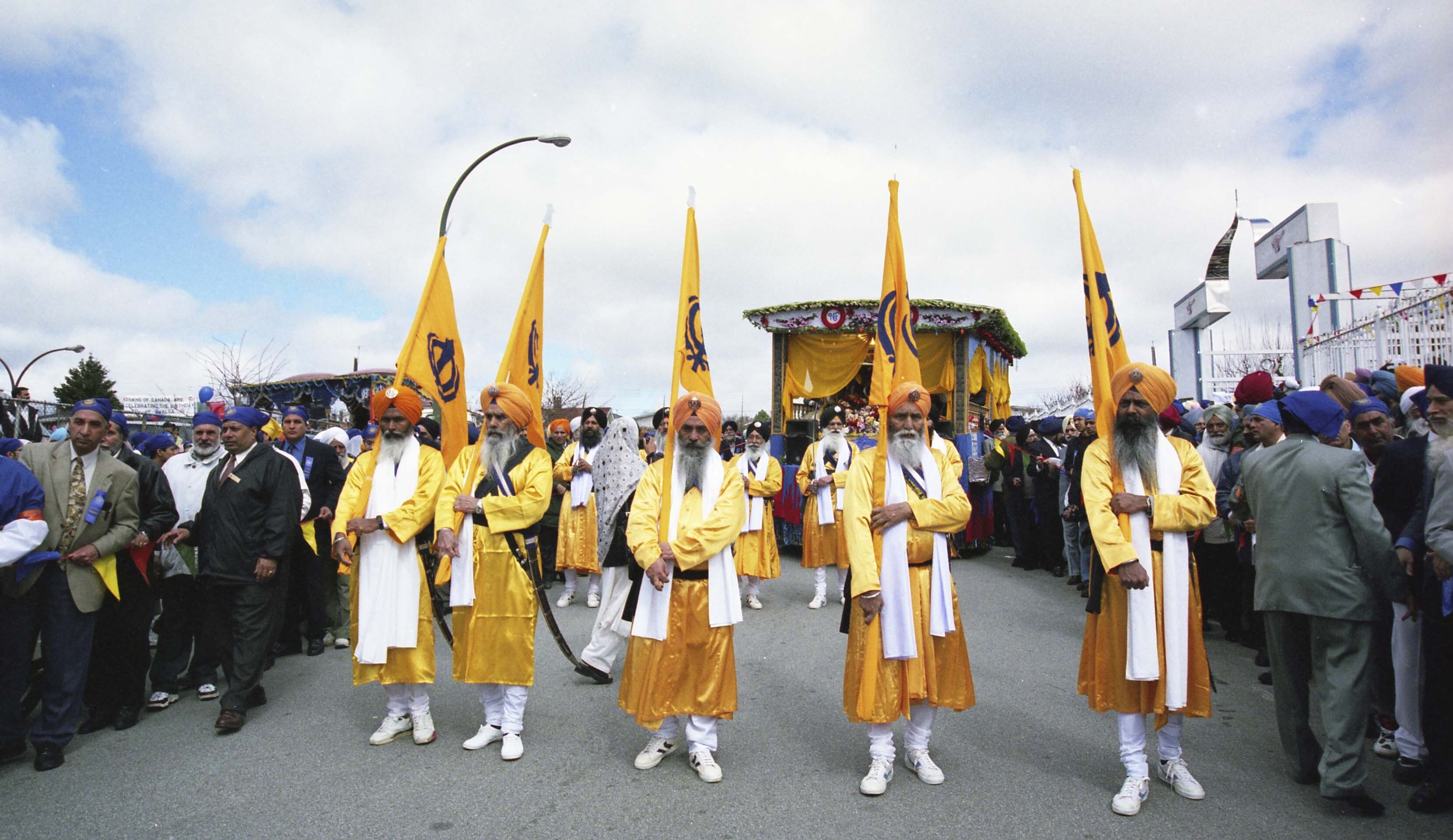 Photograph of a group of unidentified individuals, known as gursikhs, holding the nishan sahib flag outside the Sikh Temple (gurdwara) located in Vancouver, British Columbia (B.C.). Individuals had gathered at the Sikh Temple for the Vaisakhi Nagar Kirtan, an annual event hosted and organized by the Khalsa Diwan Society in Vancouver.