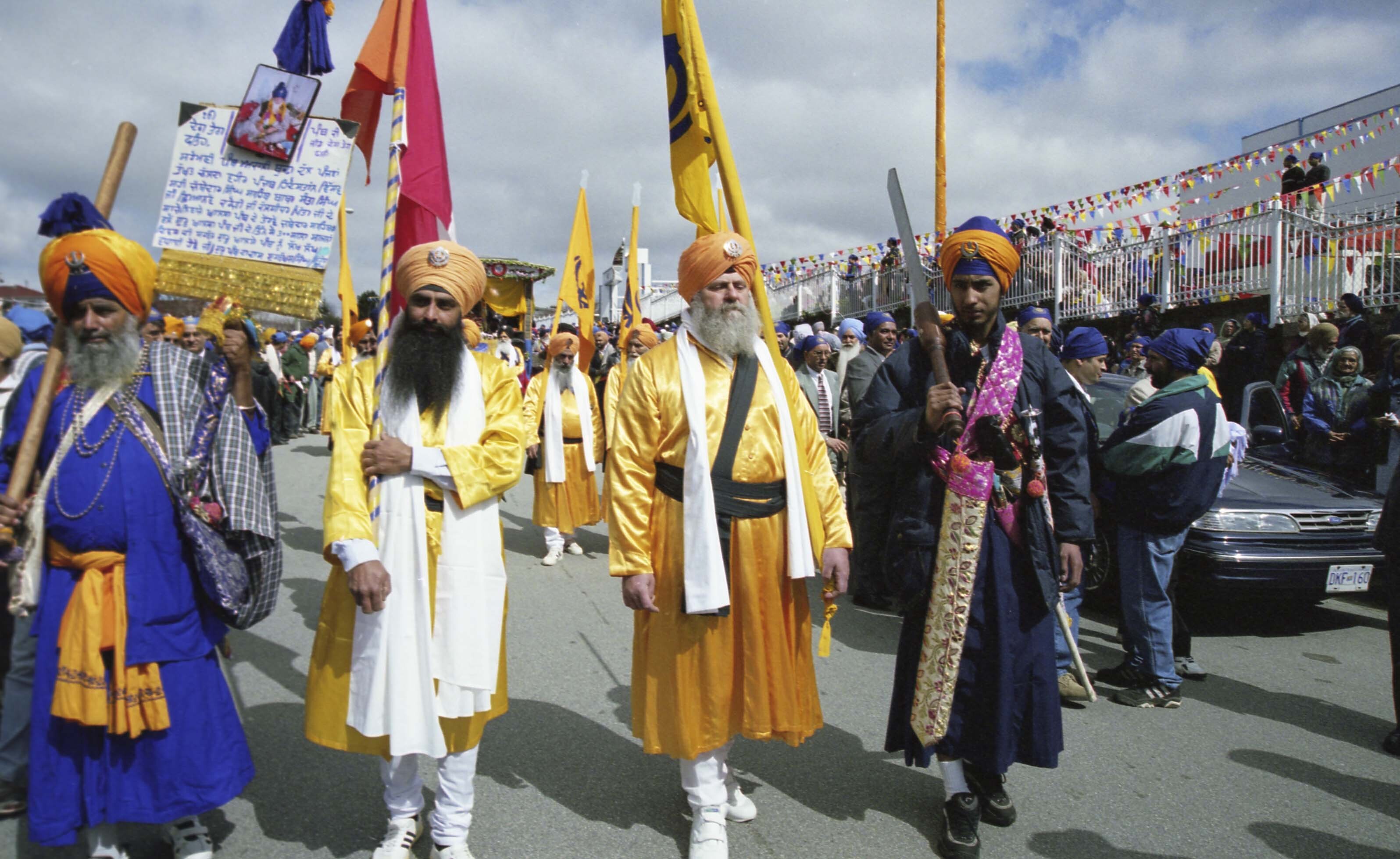 Photograph of a group of unidentified individuals, including gursikhs and nihangs, outside the Sikh Temple in Vancouver, British Columbia (B.C.). Individuals had gathered at the Sikh Temple for the Vaisakhi Nagar Kirtan, an annual event which takes place in Vancouver and is organized by the Khalsa Diwan Society of Vancouver.