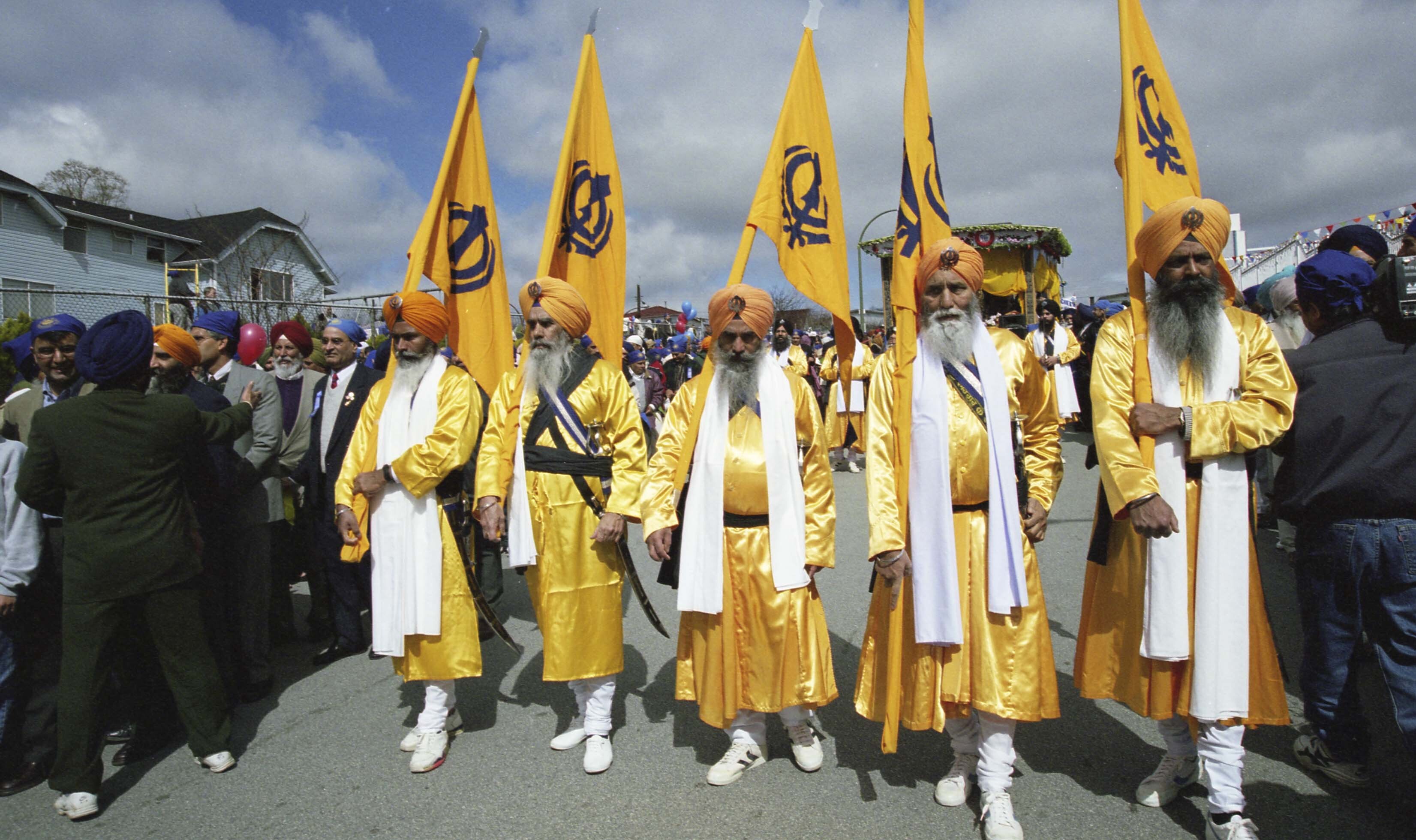 Photograph of a group of unidentified individuals, known as gursikhs, holding the nishan sahib flag outside the Sikh Temple (gurdwara) located in Vancouver, British Columbia (B.C.). Individuals had gathered at the Sikh Temple for the Vaisakhi Nagar Kirtan, an annual event hosted and organized by the Khalsa Diwan Society in Vancouver.