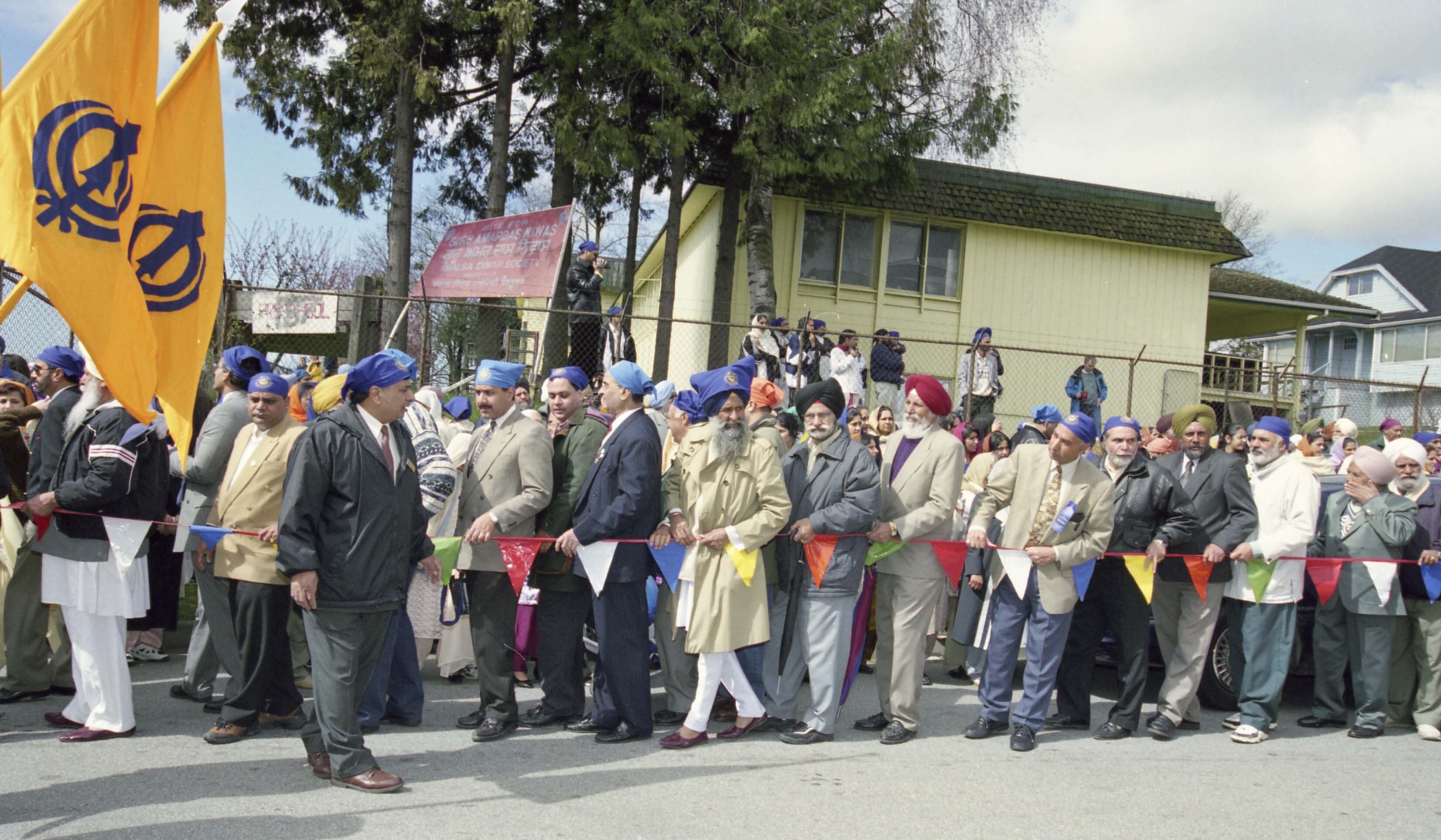 Photograph of a group of unidentified individuals at the Vaisakhi Nagar Kirtan in Vancouver, British Columbia (B.C.). The Vaisakhi Nagar Kirtan is an annual event which takes place in Vancouver and is organized by the Khalsa Diwan Society of Vancouver.