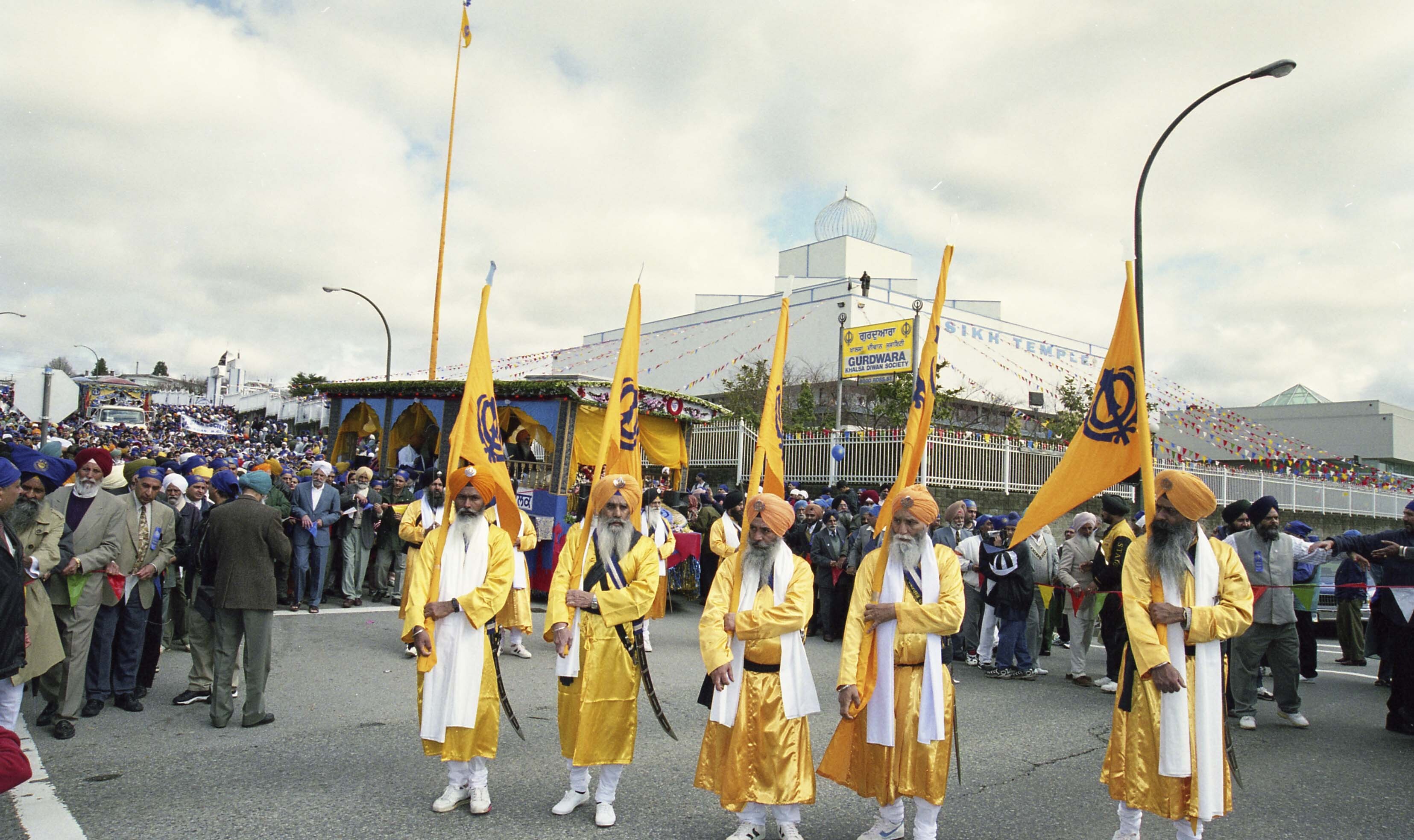 Photograph of a group of unidentified individuals, known as gursikhs, holding the nishan sahib flag outside the Sikh Temple (gurdwara) located in Vancouver, British Columbia (B.C.). Individuals had gathered at the Sikh Temple for the Vaisakhi Nagar Kirtan, an annual event hosted and organized by the Khalsa Diwan Society in Vancouver.