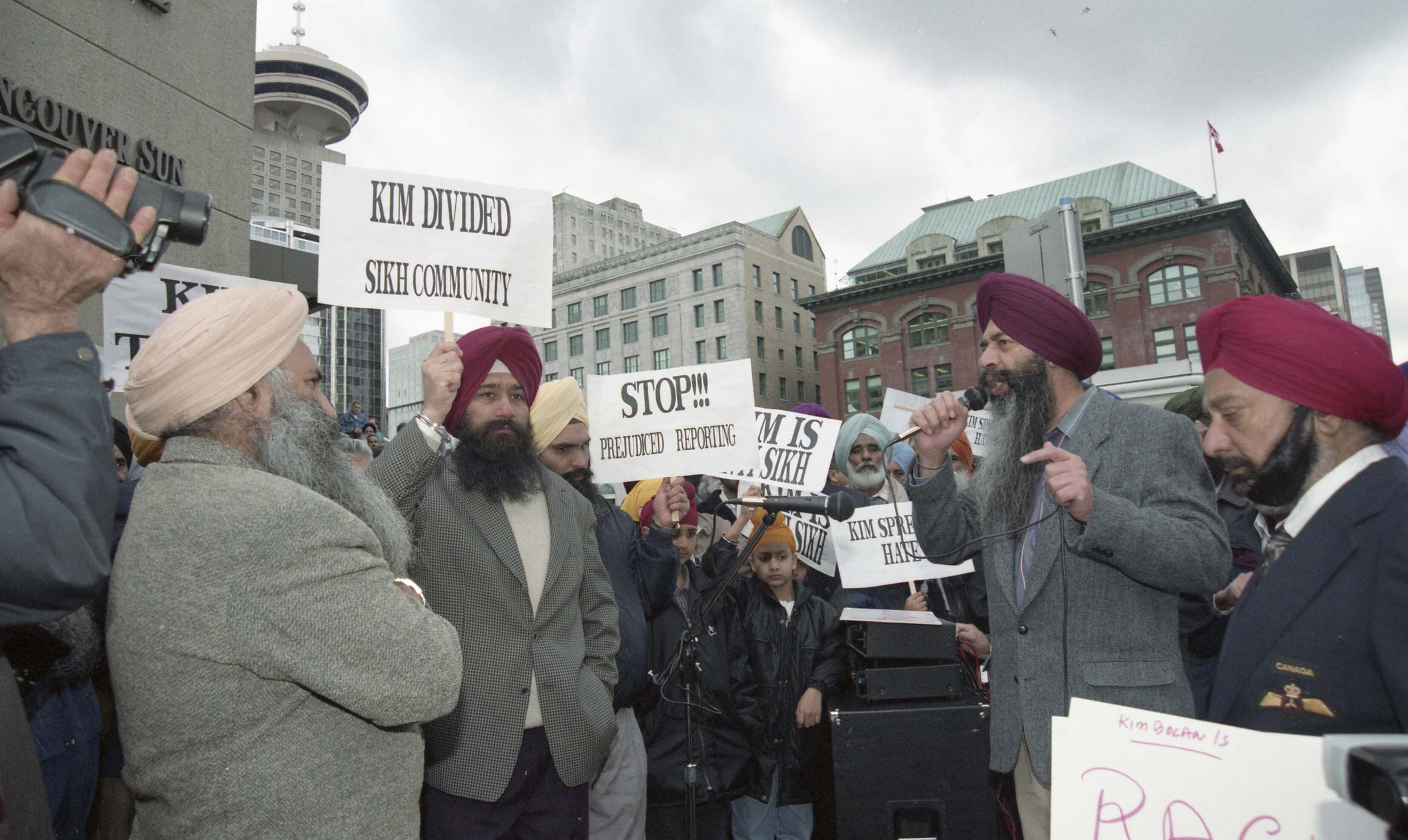 Photograph of a group of unidentified individuals protesting against Kim Bolan outside the Vancouver Sun office, located at Granville Square in Vancouver, British Columbia (B.C.).