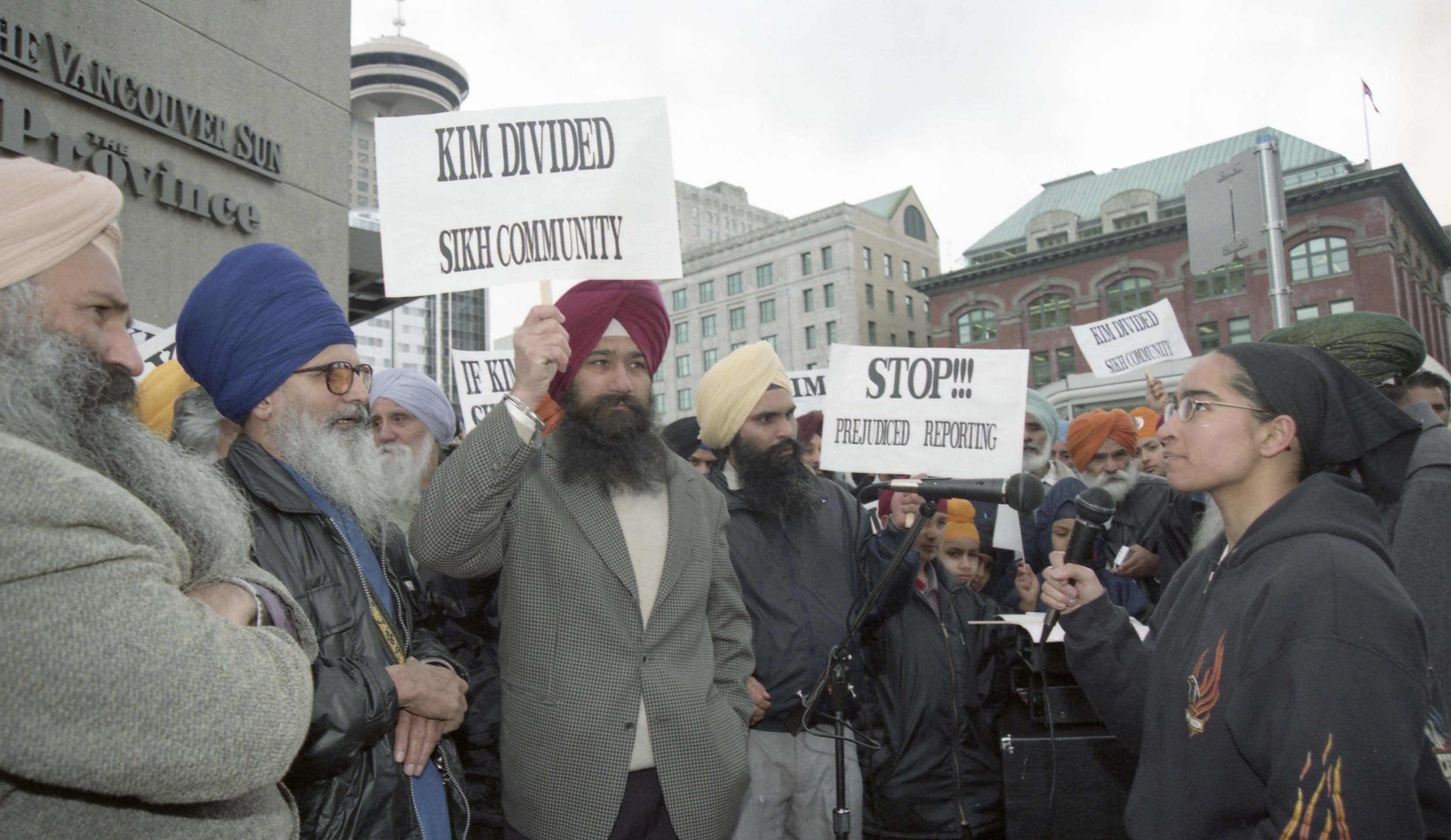 Photograph of a group of unidentified individuals protesting against Kim Bolan outside the Vancouver Sun office, located at Granville Square in Vancouver, British Columbia (B.C.).