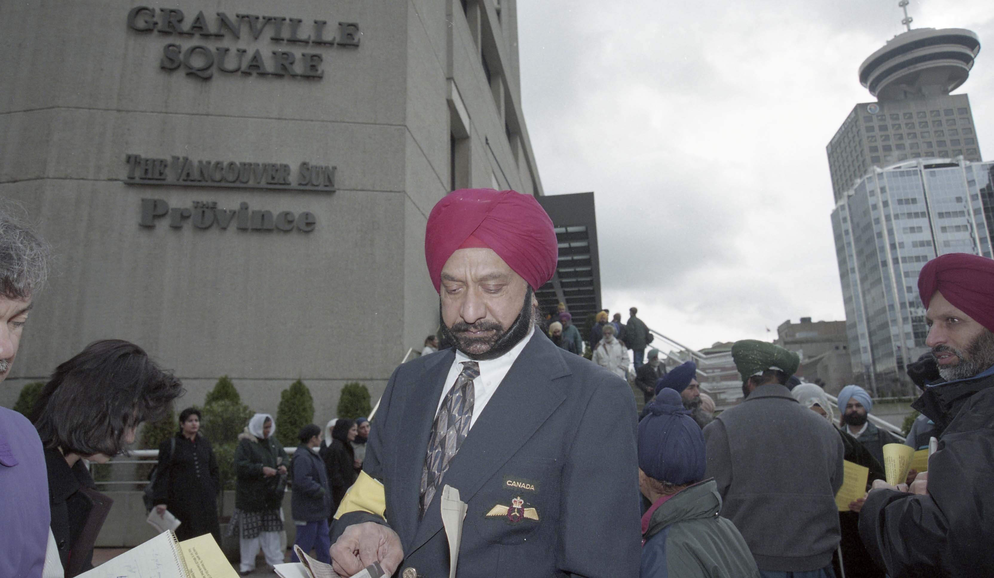 [Photograph of an individual outside the Vancouver Sun office at Granville Square]